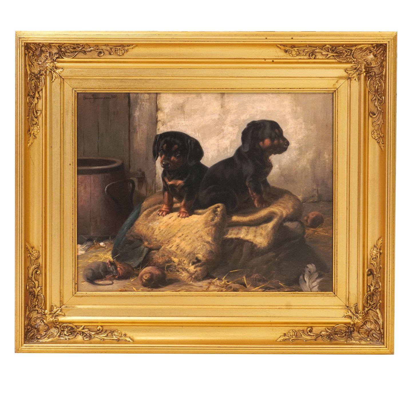 Simon Simonsen, 1841-1928, oil on canvas. Two dogs. Signed and dated 1889. Visible size: 31x39cm. With frame: 50x58cm