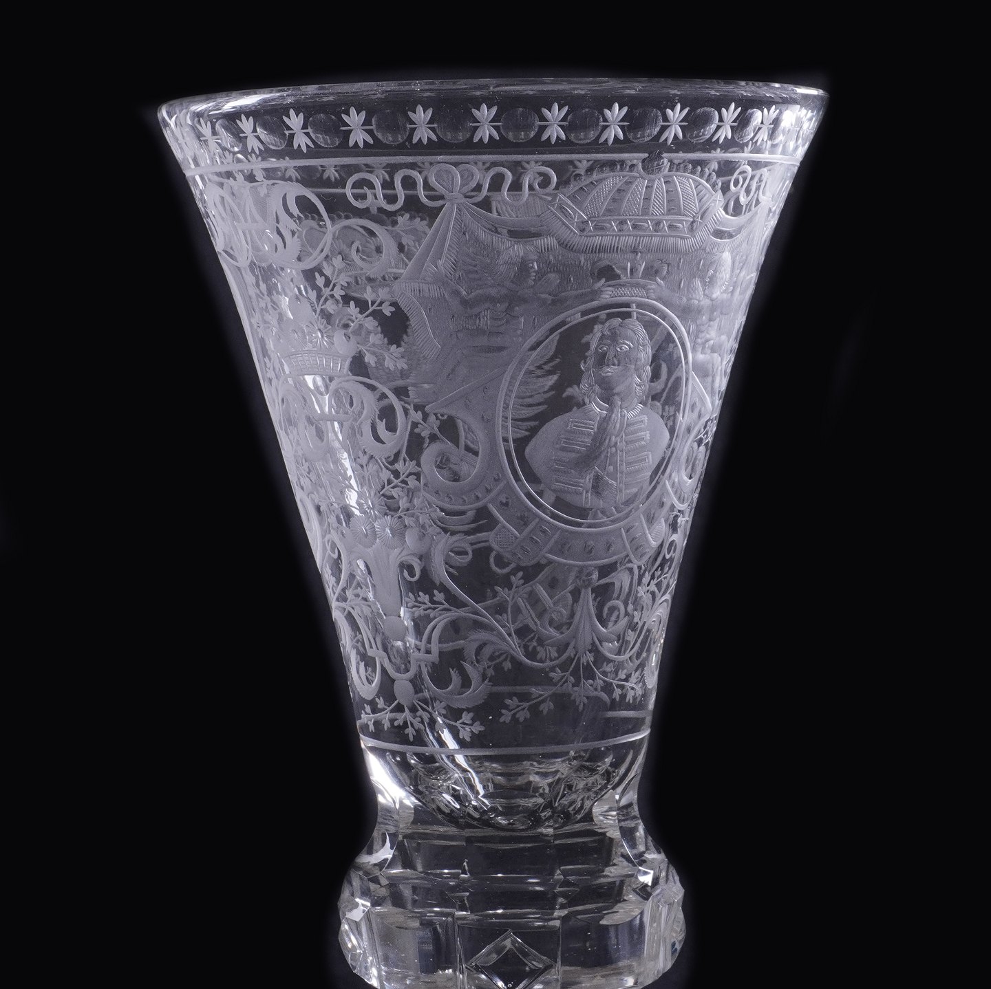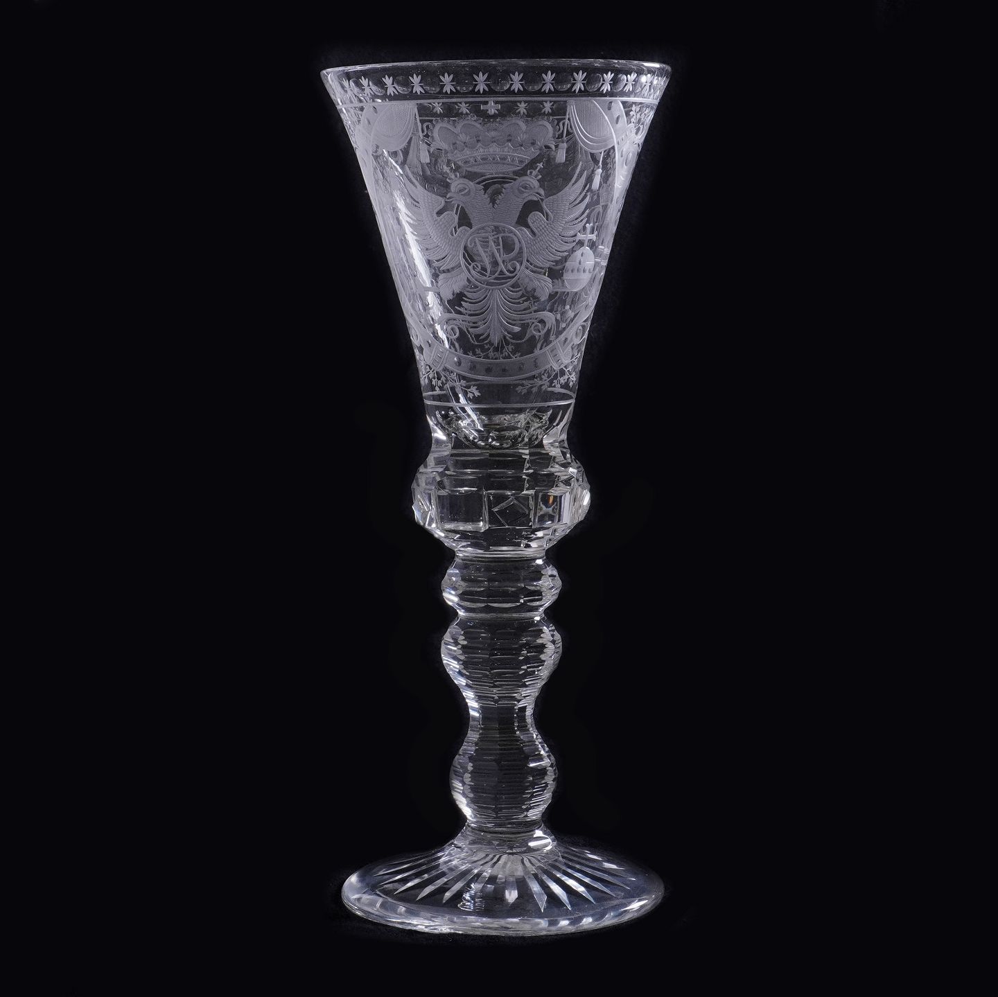 Tysk glas pragtpokal indgraveret med adeligt portræt og kronet spejlmonogram. Thürringen 1730-50. H: 28cm