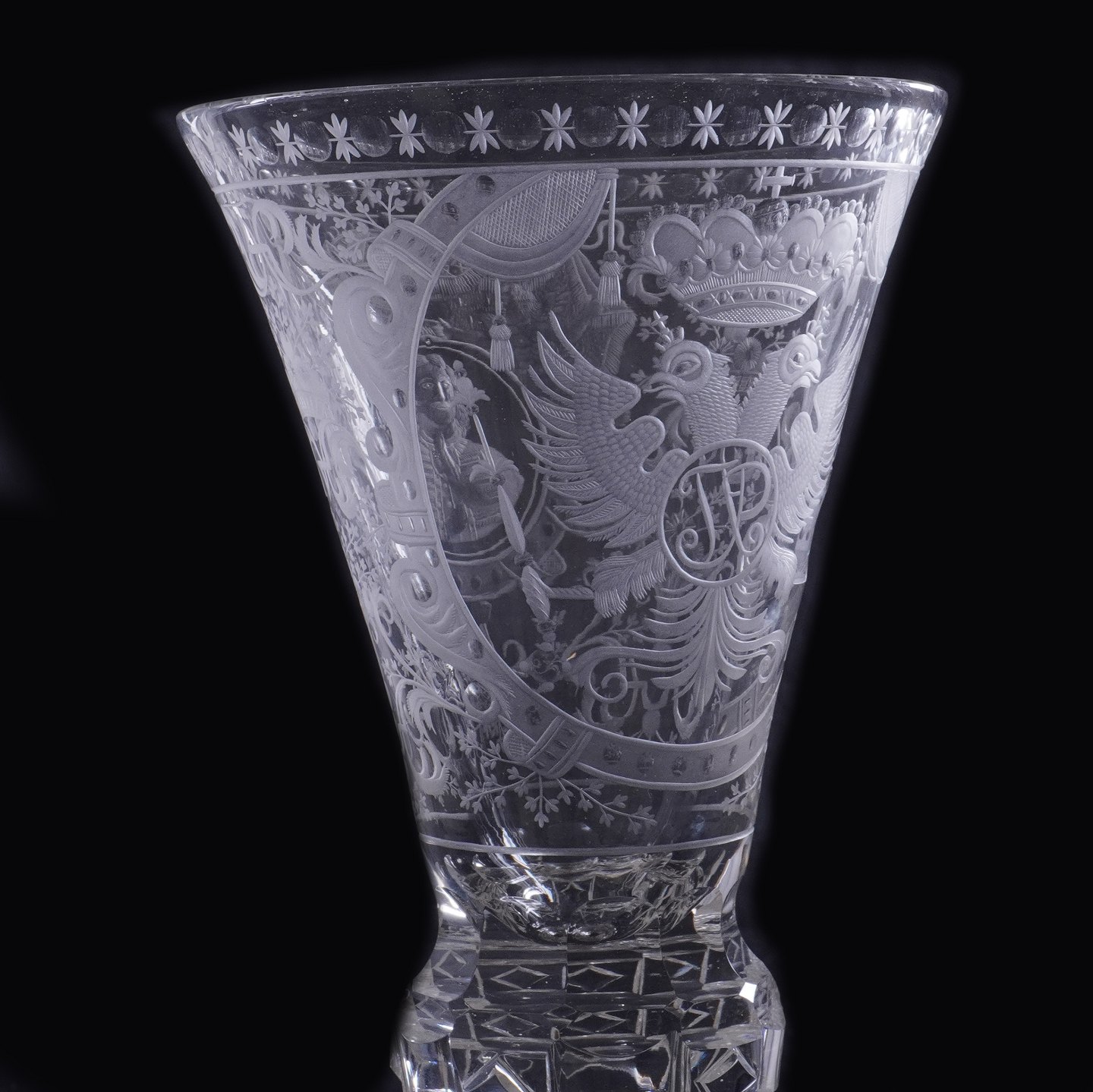 Tysk glas pragtpokal indgraveret med adeligt portræt og kronet spejlmonogram
