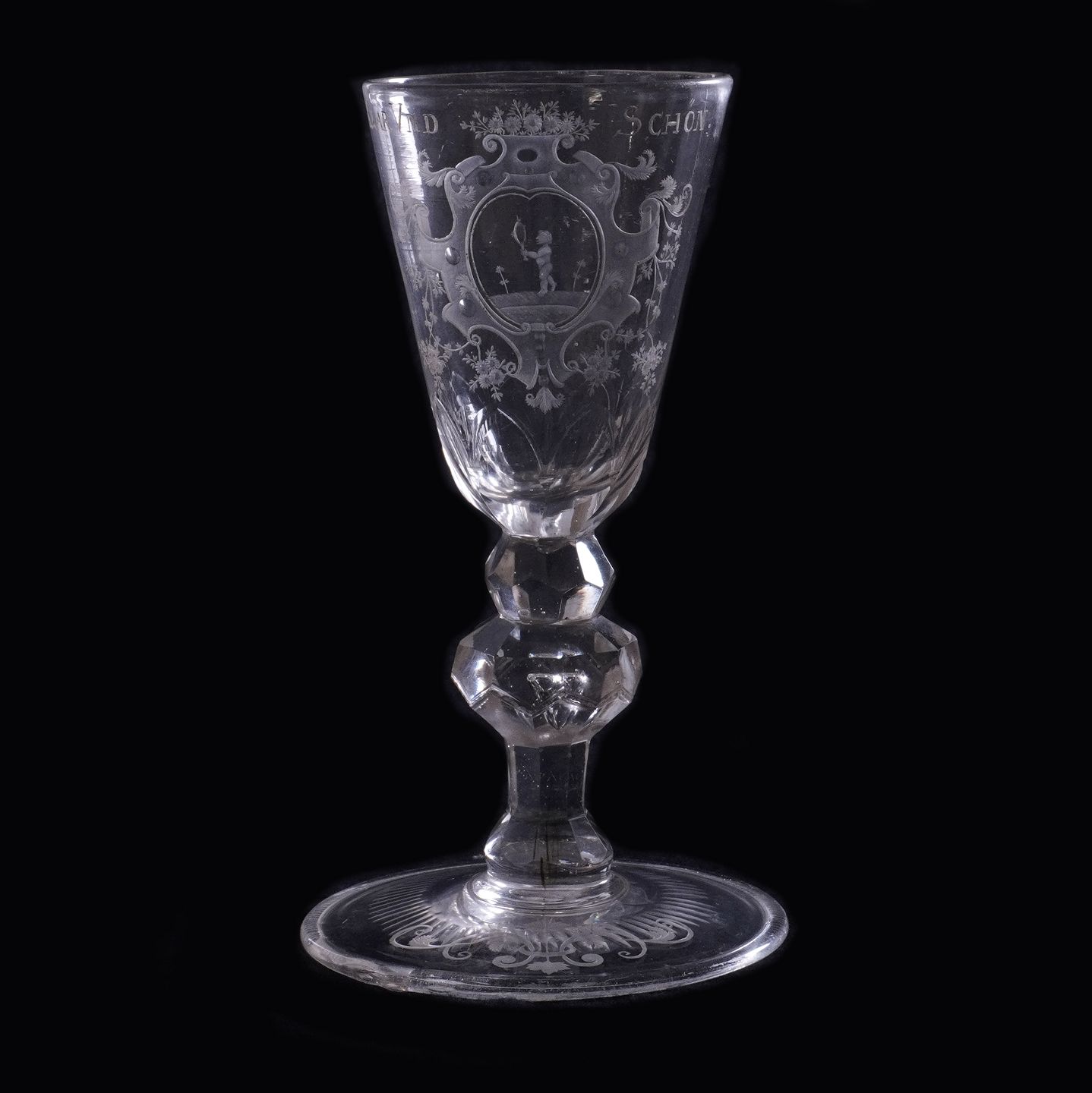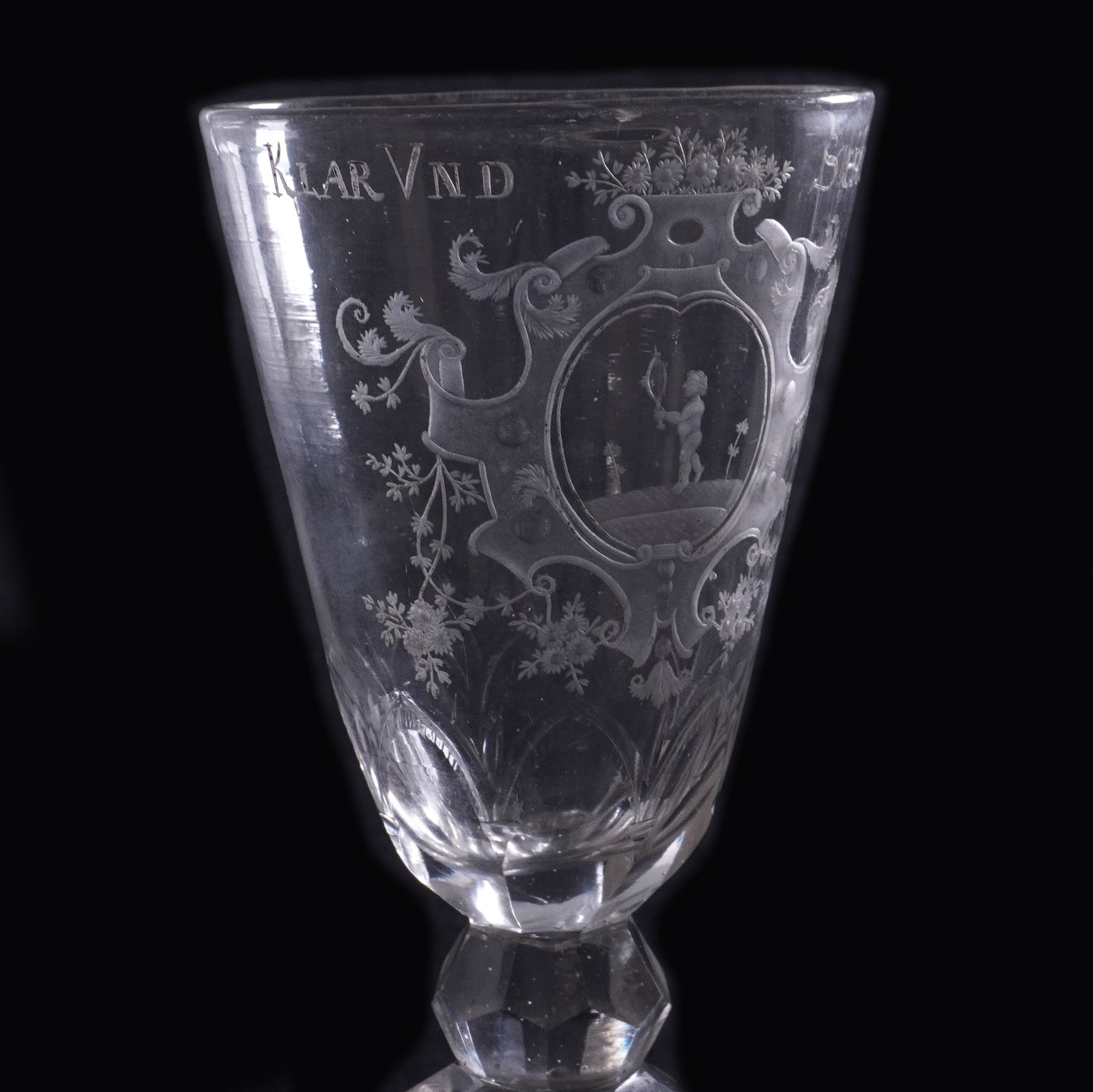 Tysk glaspokal med indgravering "Klar und Schön". Sandsynligvis Sachsen ca. år 1750. H: 20cm