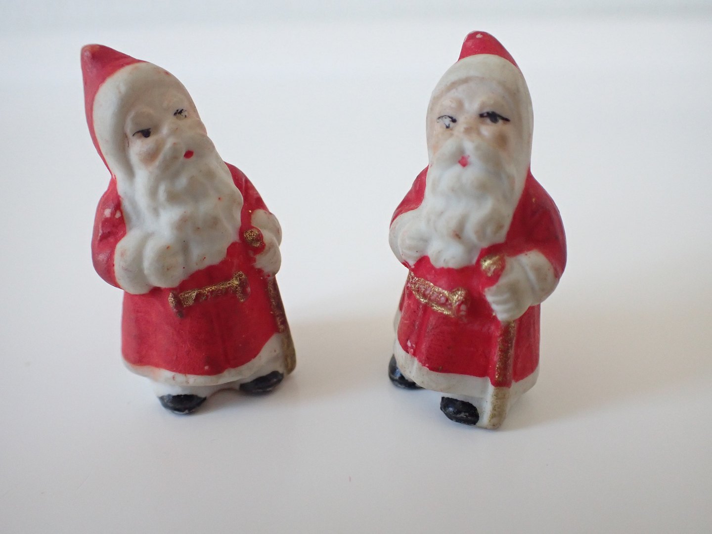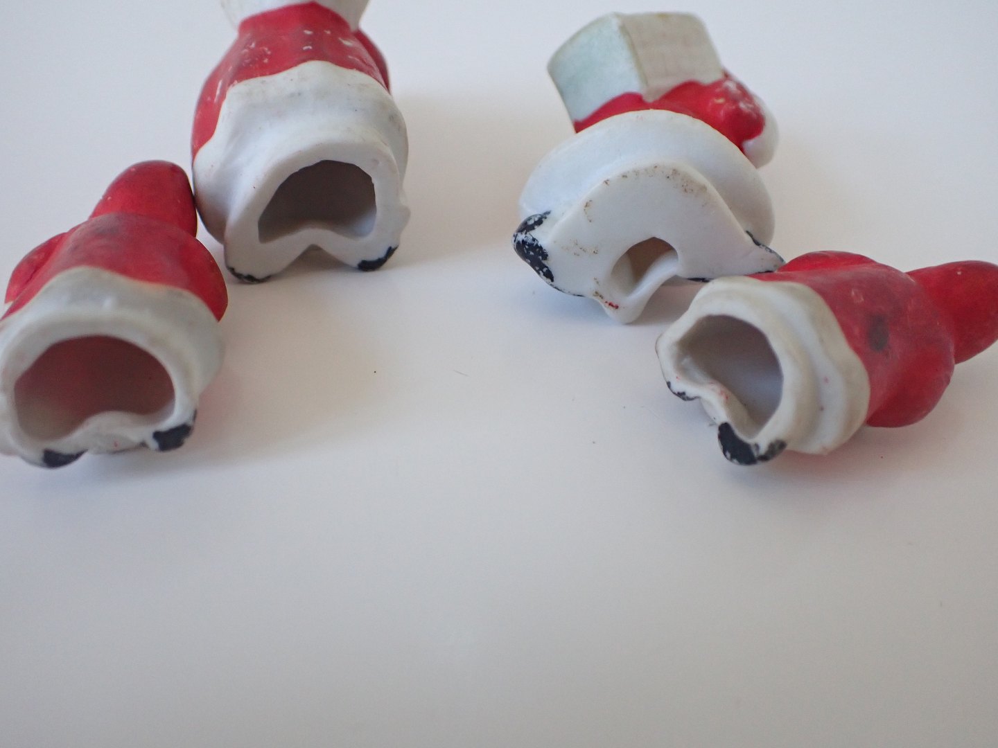 4 håndmalede tyske biscuit julemænd 2 med gavesække på ryggen og 2 uden.. Ca. 1930. Højde: 2 stk. på 3,8 til 250 kr. pr. stk. og 2 stk. 5 cm. til 300 kr. pr. stk. I pæn tidstypisk stand.