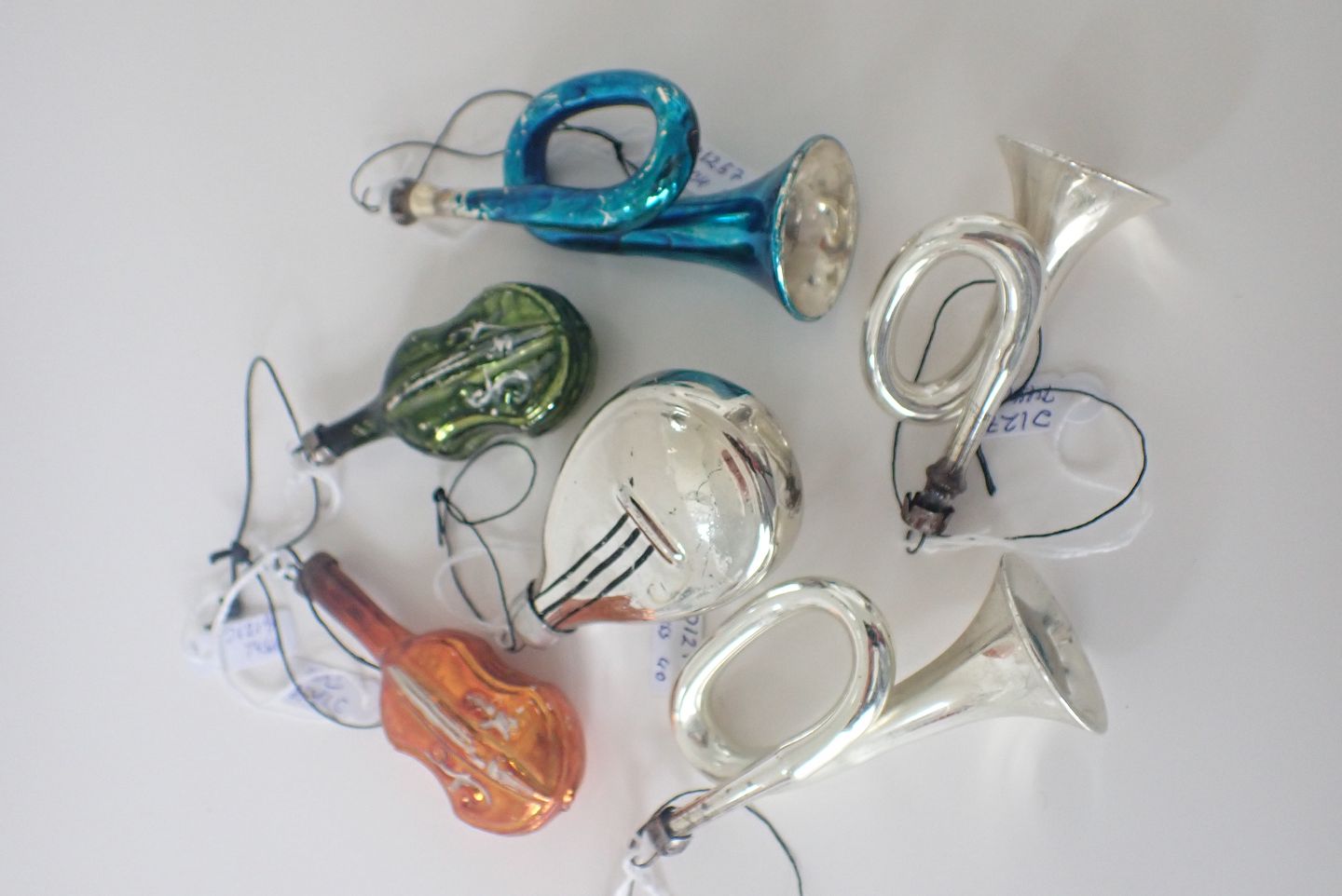 6 stk. glasjulepynt - musikinstrumenter. Sælges individuelt. Den blå og sølvfarvet trompet er solgt.