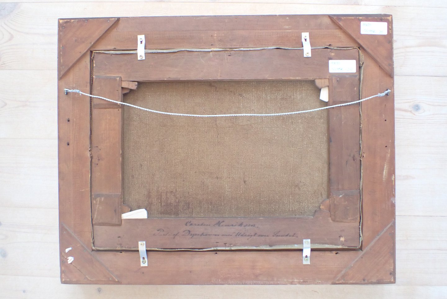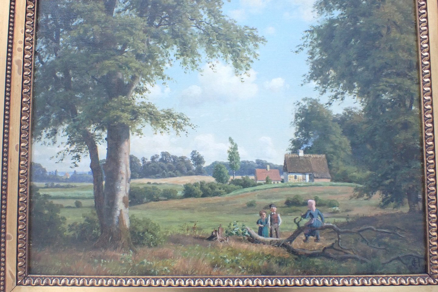 Carsten Hentichsen (1824 - 1897) - indrammet maleri. Olie på lærred. Signeret med initialer CH 1871. Fuld signeret på bagsiden med beskrivelse : "Parti af Dyrehaven med udsigt over Sundet".Børn i forgrunden. Formodentlig daværende udsigt over eksisterende hus nær strandvejen ved Springforbi. Mål: 29 x39 cm. med ramme: 39,5 x 49,5 cm. I fin nyrestaureret stand af professionel konservator.