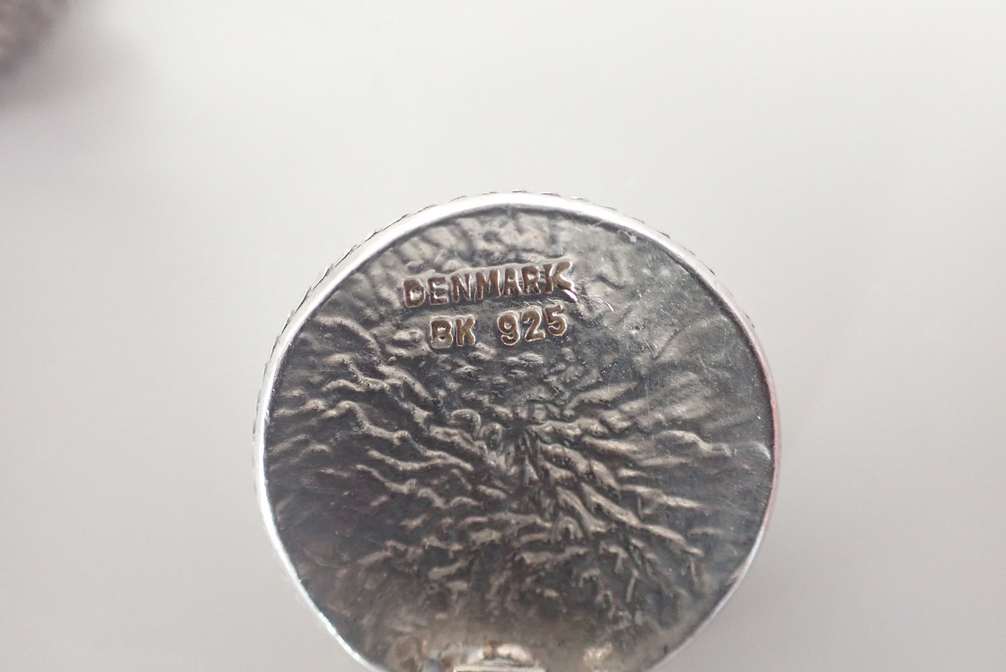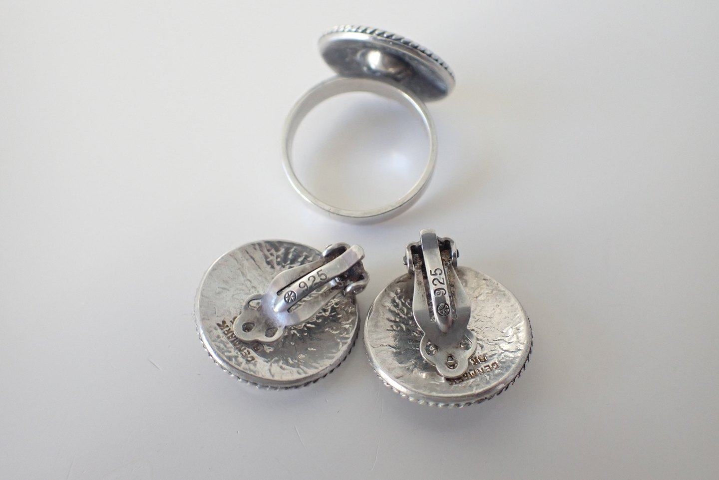 Bonells - sterling sølvsæt med sølvcirkler og en guldhalvperle i midten, bestående af ring, str. 57 og øreklips. Stemplet Denmark, BK og 925s. Samlet vægt: 17,5 gram. Bredde på ringcirkel: 2 cm. Skinnebredde: 0,4 c,. Ringcirkel på øreklips: 2 cm.ca. 1985. I fin stand. Sælges kun som sæt.