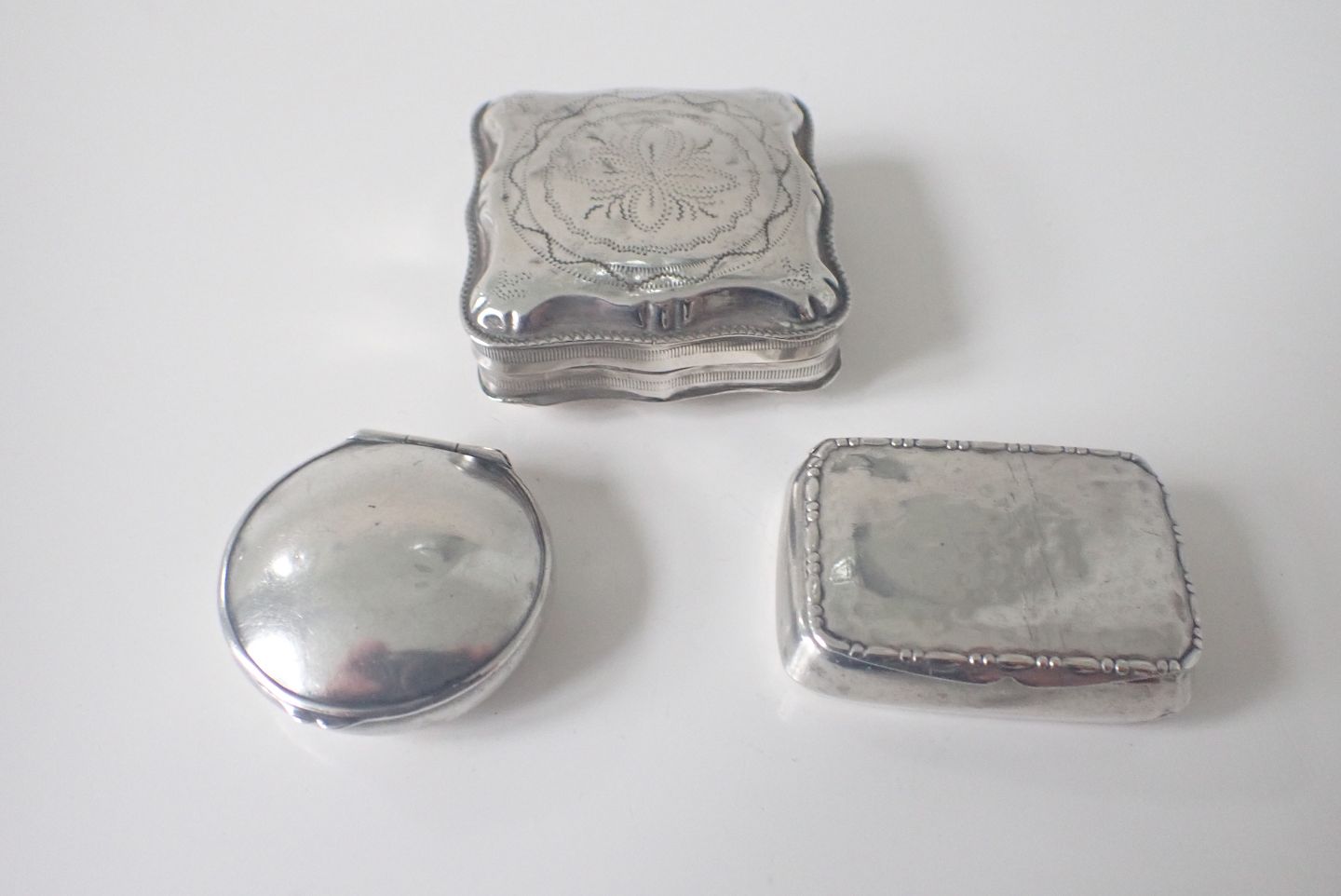 Æske bagerst: Firkantet pilleæske/tabatiere i tysk sølv med punslet dekorationer på forside, bagside og kanter. Tidlig 1800-tal. Vægt: 20,3 gram. Højde: 2,1 cm. bredde: 4,5 cm. I fin stand i forhold til alder. Pris: 600 kr.