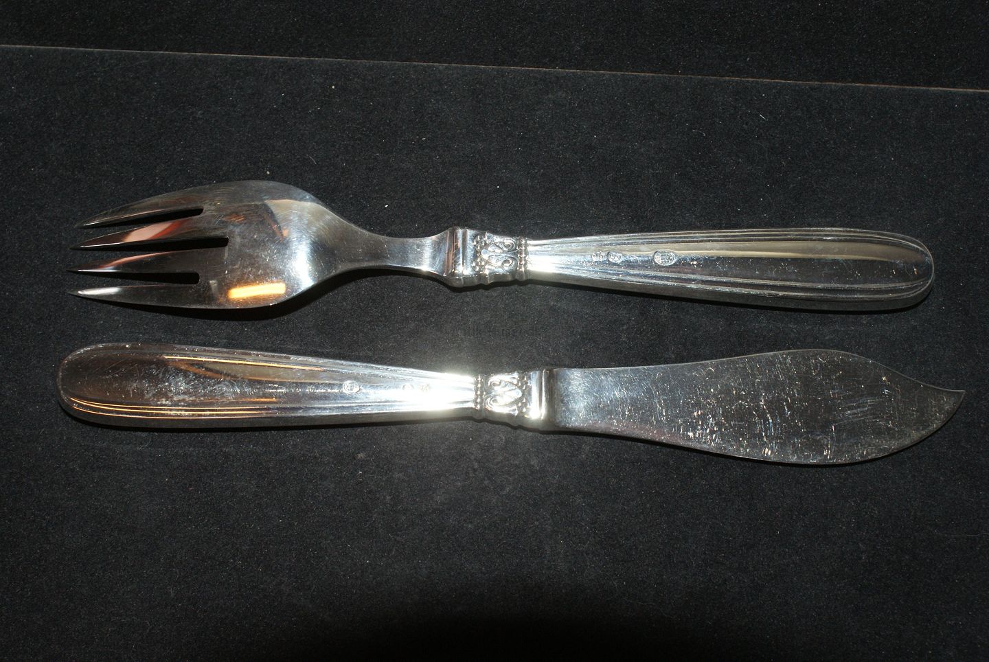 Fish cutlery set Karina Silver Horsens silver Fork length 19,2 cm. Knife length 19.5 cm. Used and well maintained. All cutlery is polished and packed in a bag