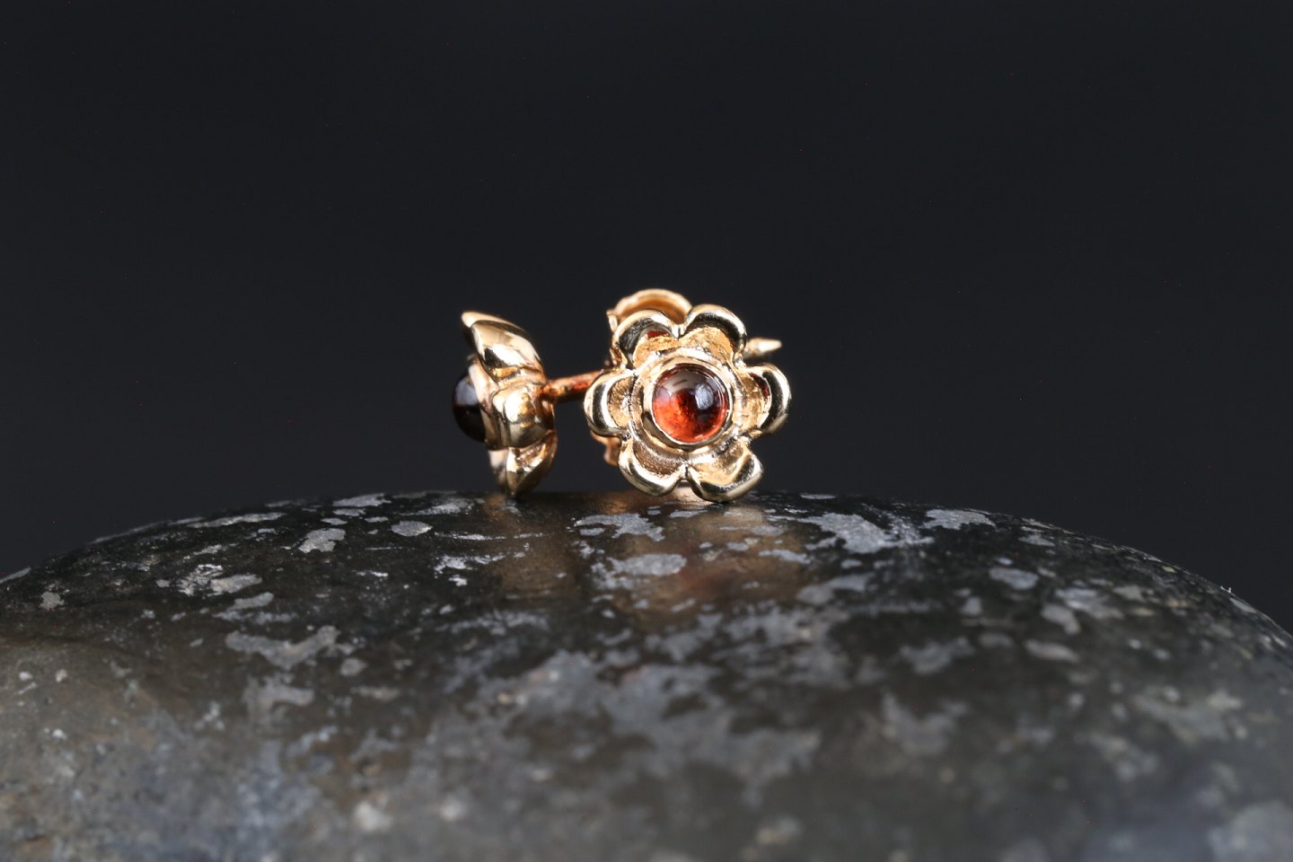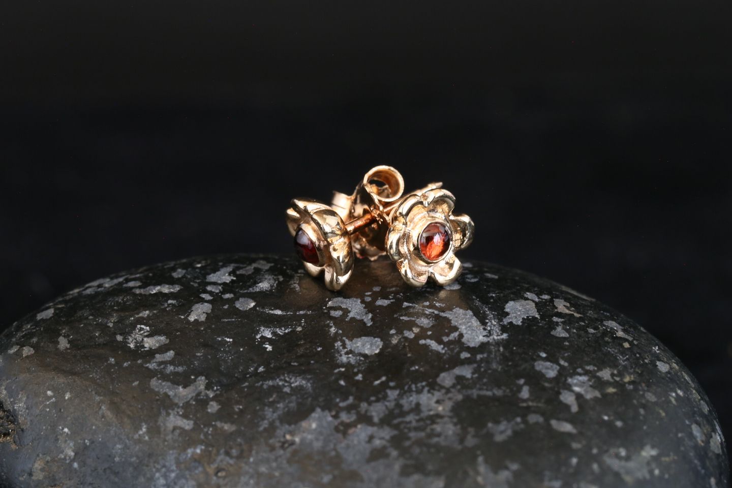 Beautifully detailed earrings in 14 carat gold, designed as small flowers. The petals of the flower are crafted in gold, with detailed soft arches. In the middle, a beautiful red stone is inlaid, which gives a nice finish to these ear studs. The earrings are beautiful and feminine, and can be used with a nice dress or nice sweater.