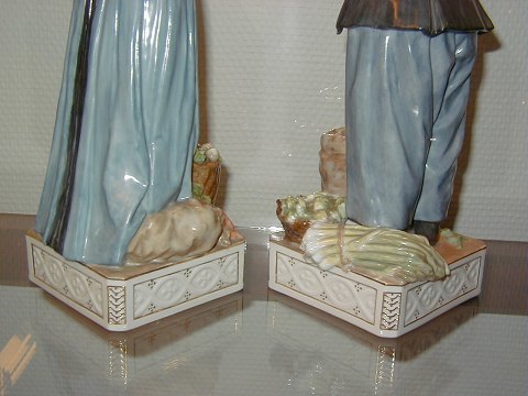 Et par store og sjældne kongelige overglasur figurer af Amagermand og kone (SOLGT) i torvedragter. De har dek. nr. 12102 samt 12103. De måler henholdsvis 31 og 32 cm. Begge er 1. sortering.