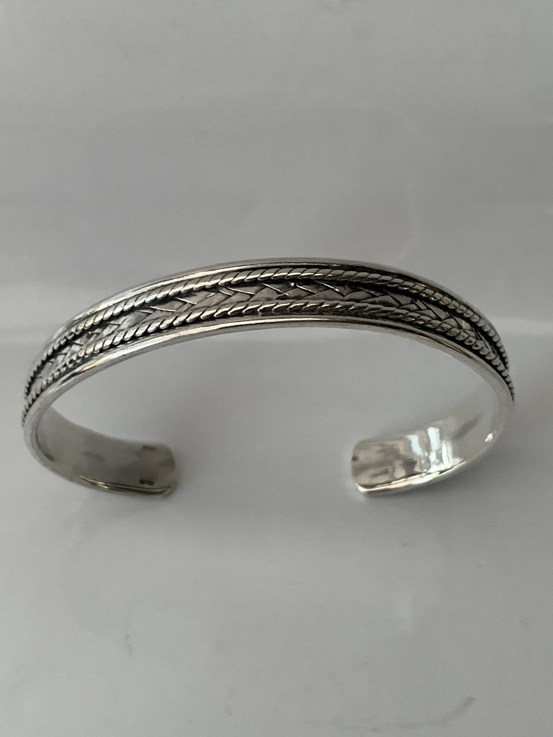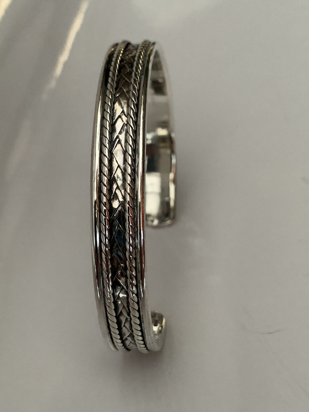 Beautiful timeless bangle with a nice pattern. The pattern has many nice details and a lot of dynamism. This makes the bangle a nice piece of arm jewelry that can be worn especially in the summer with a short-sleeved sweater or shirt.