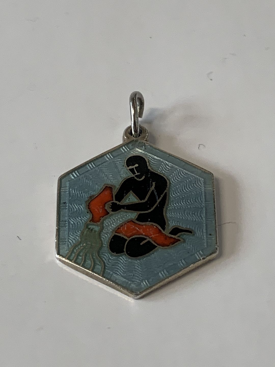 Aquarius zodiac sign Pendant with enamel in sterling silver. Stamp: 925s. Height with eyelet: 2.8 cm. Width: 2 cm. See our large selection of pendants here: https://www.antikhuset.net/katindex.asp?kukat=12179