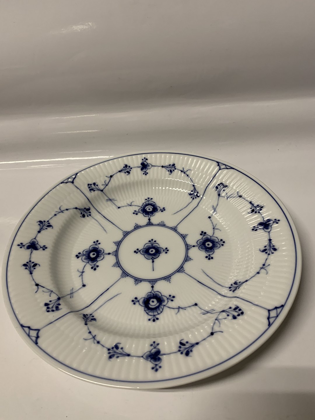 Royal Copenhagen Musselmalet Riflet, Middagstallerken. Dekorationsnummer 1/175. Diameter 25 cm. 1.sortering. Perfekt stand.