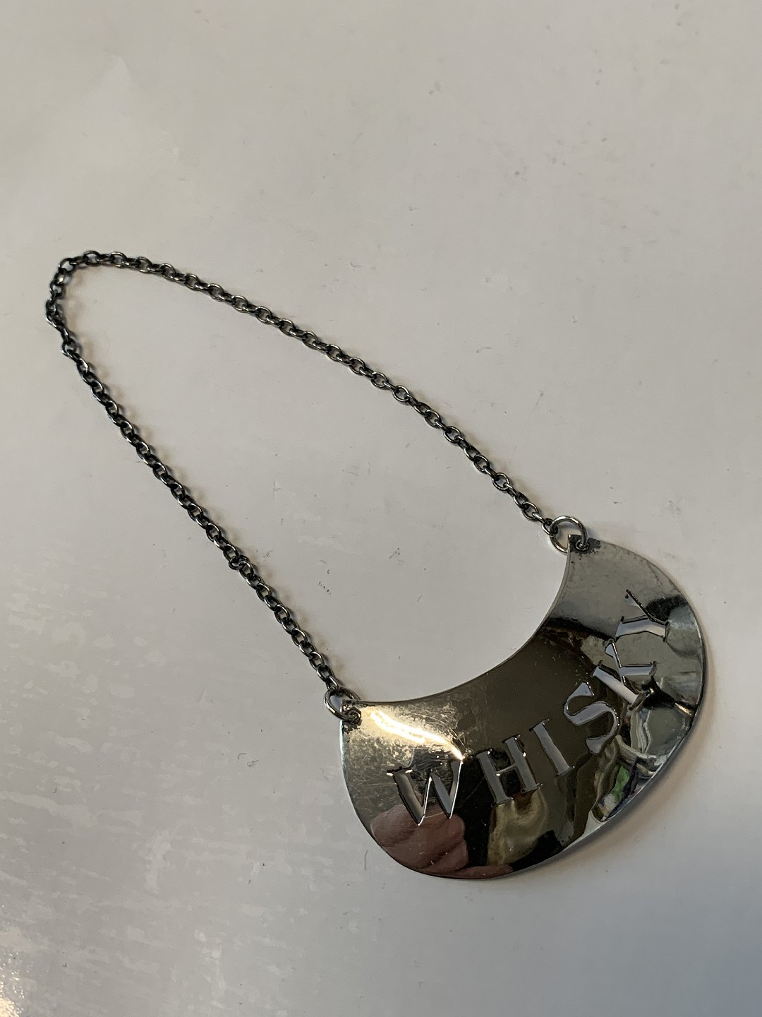 Whiskey sign, sterling, Bottle / Decanter sign. Width 5 cm. Stamped: E. Dragsted. Sterling. Nice condition.
