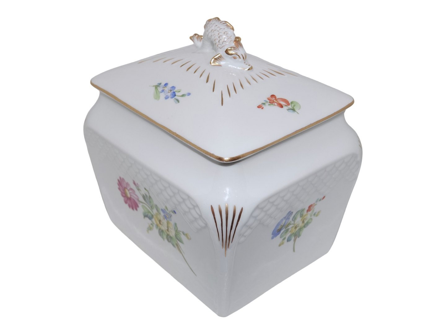 Bing & Grondahl Sachian Flower on white porcelain, lidded box for biscuits.