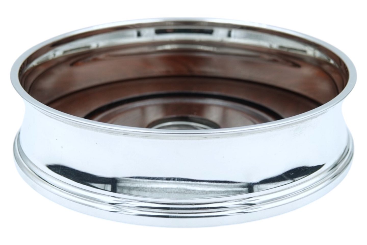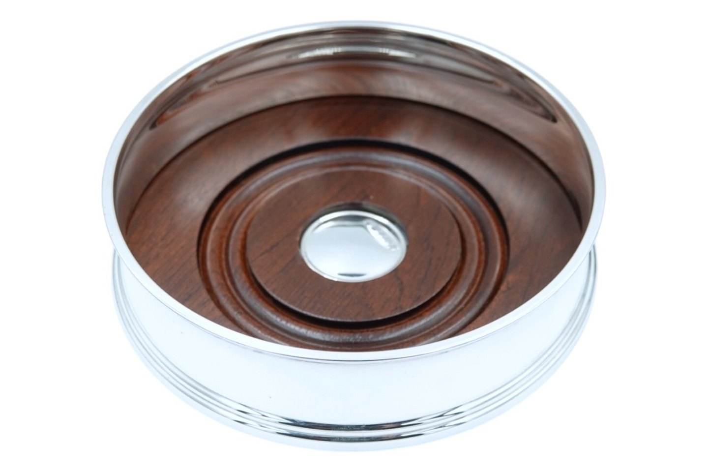 Carrs of Sheffield England, sterling silver, large bottle coaster with mahogany, made in a high quality. Fully hallmarked, please see picture. Diameter 12.5 cm. Perfect condition.