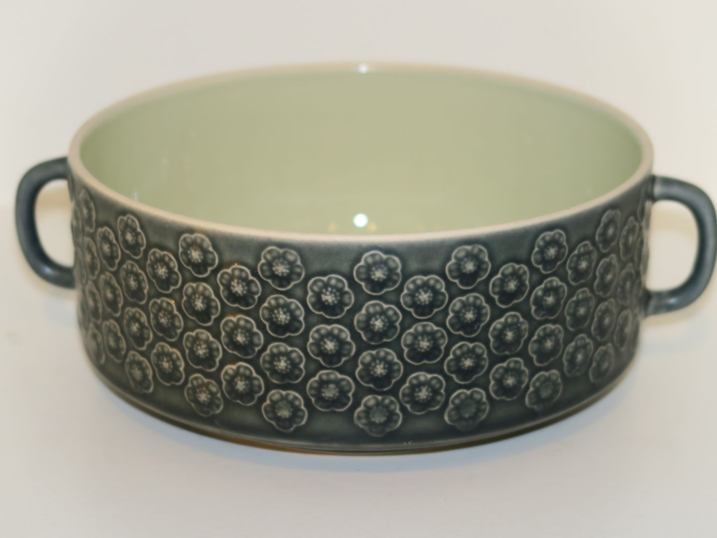 Kronjyden Azur stoneware, bowl with handles that is missing a lid. Designed by Jens Harald Quistgaard. Diameter 18.7 cm. Perfect condition.