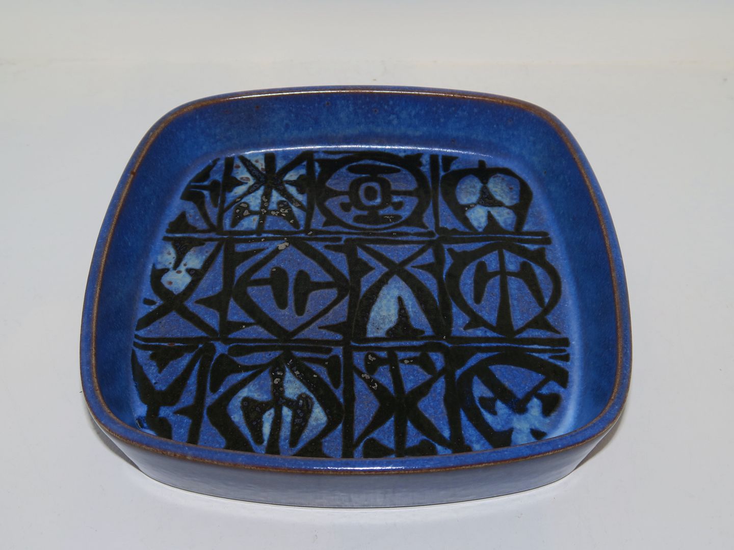 Aluminia - Royal Copenhagen Baca, blå firkantet skål. Designet af Nils Thorsson. Dekorationsnummer 704/2883. 1. sortering. Måler 17,0 x 16,8 cm. Perfekt stand uden fejl.