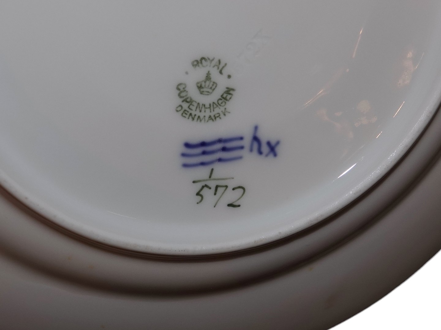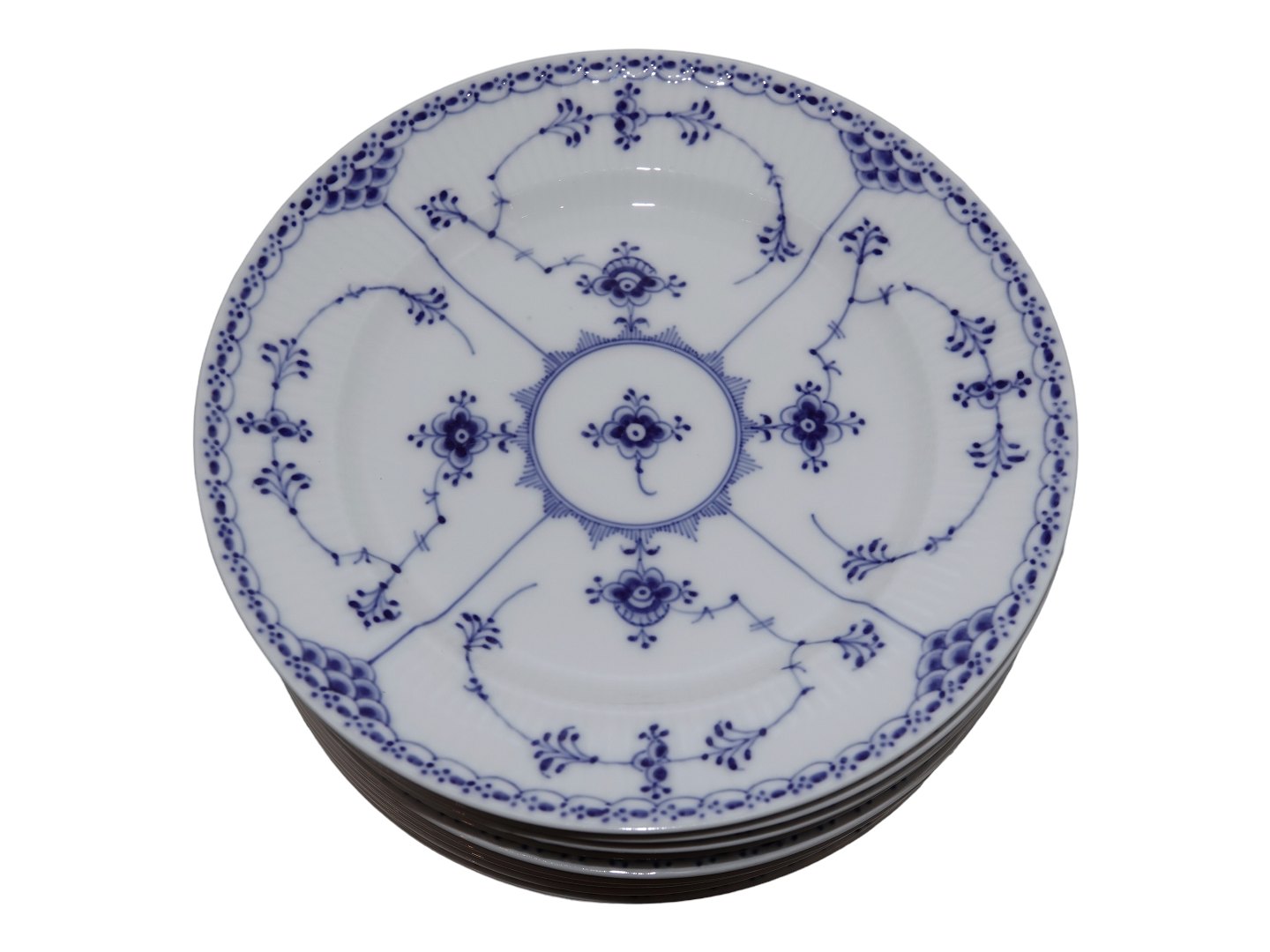Royal Copenhagen Musselmalet Halvblonde, frokosttallerken. Dekorationsnummer 1/572. 1. sortering men har lidt encellet i glasuren. Diameter 22,5 cm. Perfekt stand uden fejl.