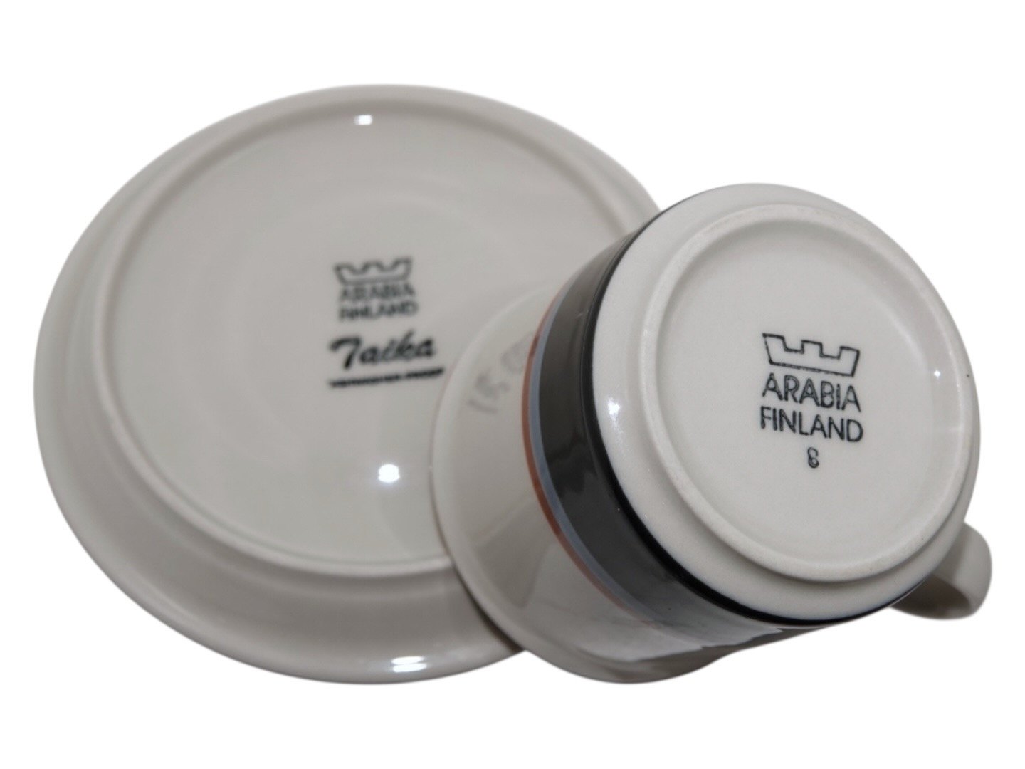 Arabia Finland Taika, small coffee cup with matching saucer. Designed by Anja Jaatinen-Winquist in 1968. The cup measures 6.7 cm. across and 6.3 cm. in height. Perfect condition.