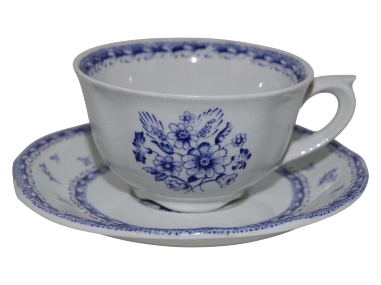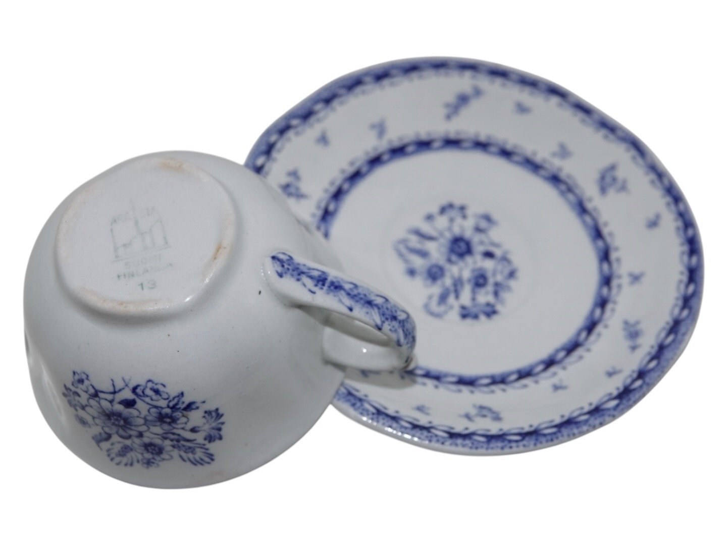 Arabia Finland Suomen Kukka (Finland Flower), coffee cup with matching saucer. Designed by Anja Jaatinen-Winquist in 1968. The cup measures 8.4 cm. across and 4.9 cm. in height. Perfect condition.