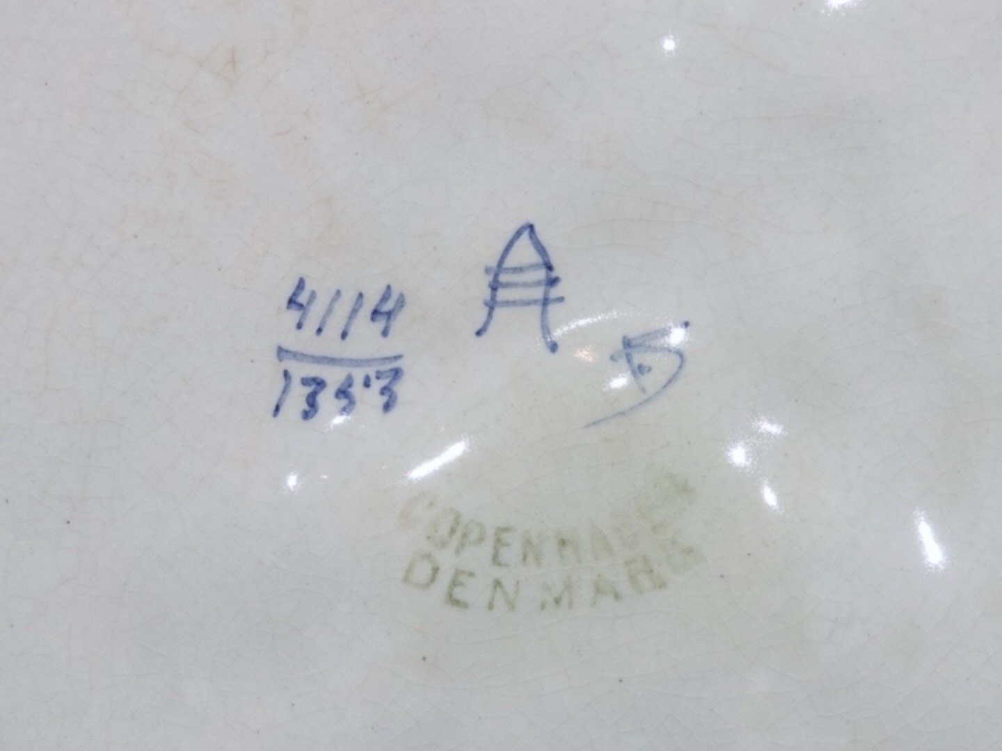 Aluminia Tranquebar, stor og sjælden set juleplatte fra 1927. Dekorationsnummer 4114/1353. 1. sortering. Diameter 30,5 cm. Der er krakkeleringer og små misfarvninger i glasuren ellers fejlfri stand uden fejl.