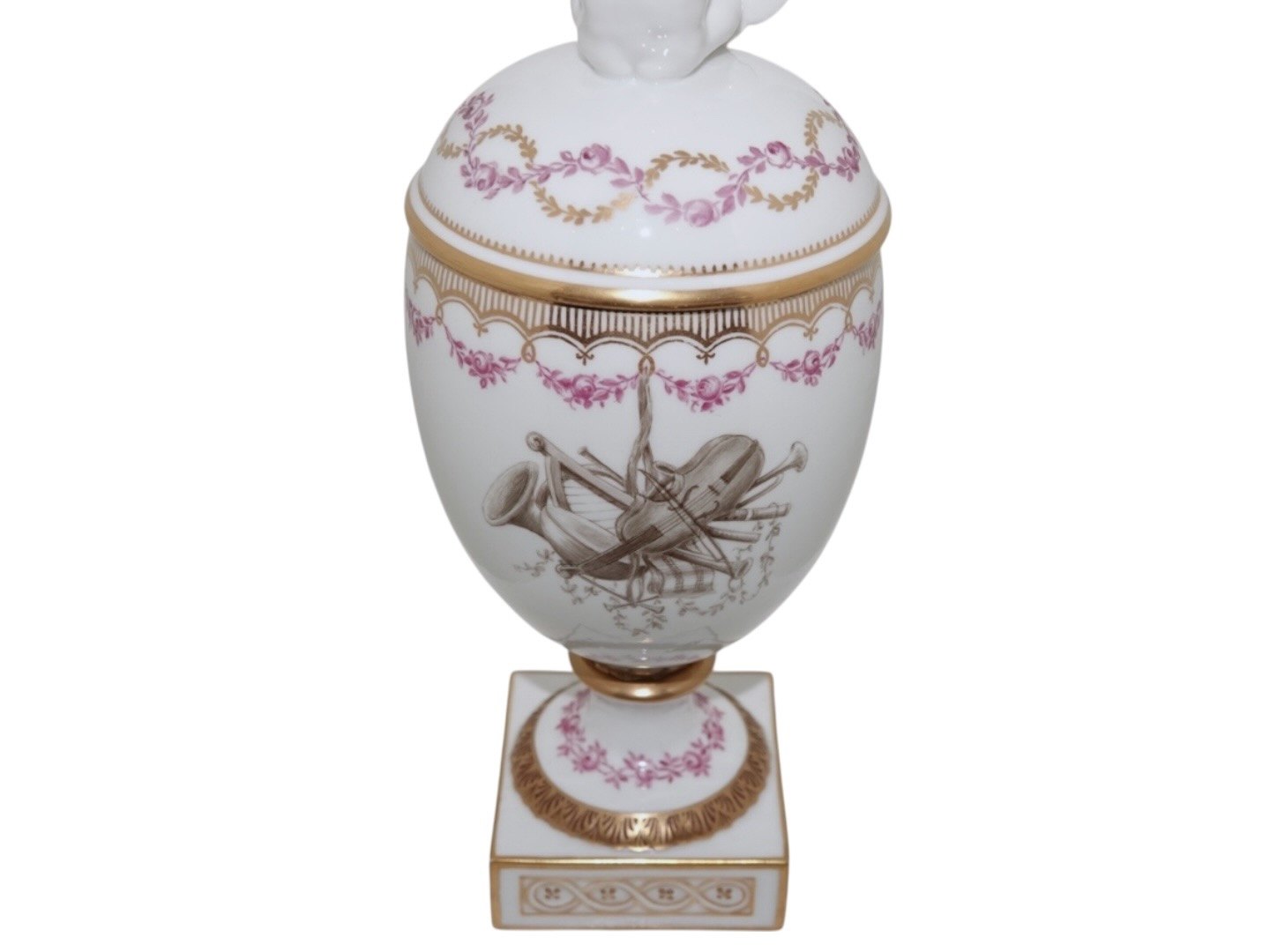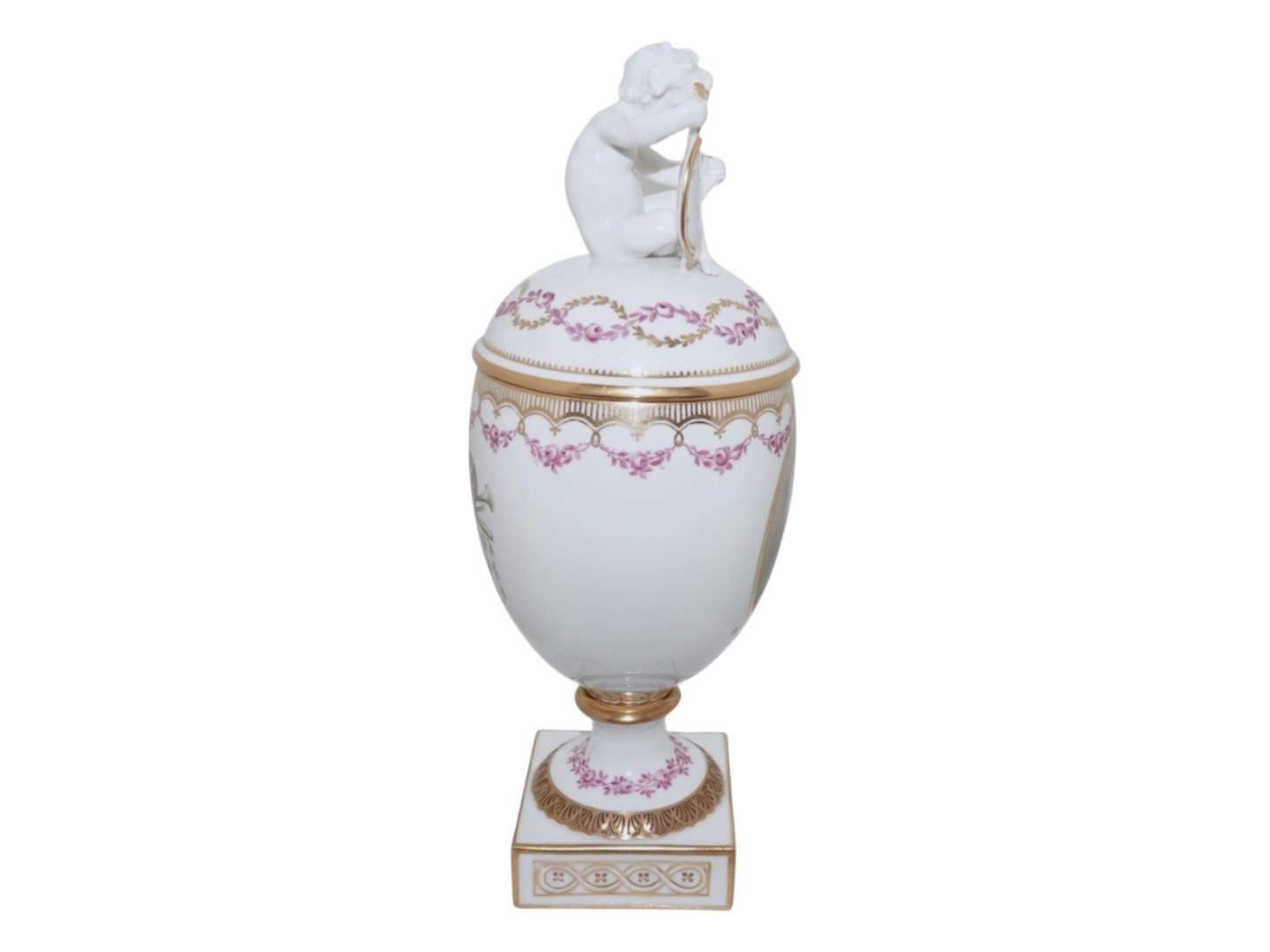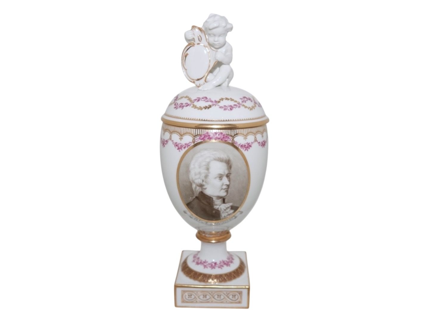 Royal Copenhagen, lidded Putto vase with Mozart with pink decoration. Factory second. This was produced before 1894. Height 27.0 cm. Perfect condition with no chips, cracks or repairs.