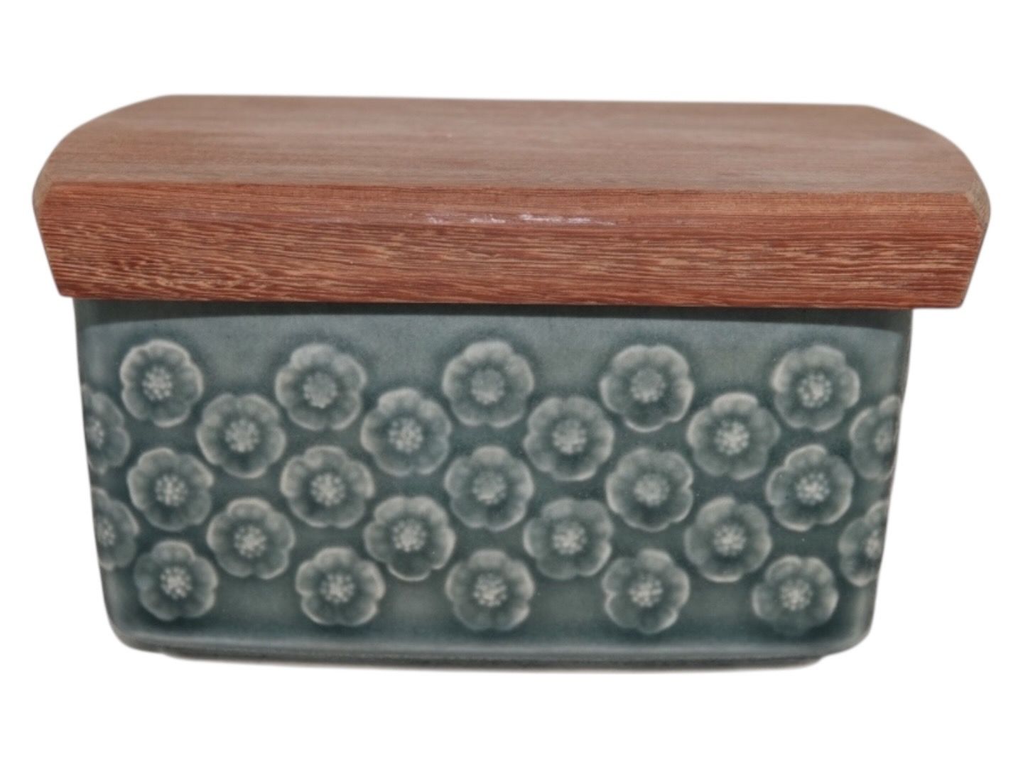 Kronjyden Green Azur stoneware, lidded bowl for butter. Designed by Jens Harald Quistgaard. Measures 12.0 by 8.3 cm. Perfect condition.