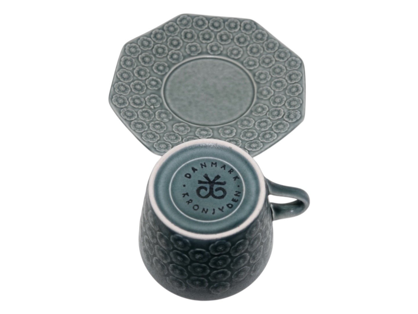 Kronjyden Azur stoneware, cup with matching saucer. Designed by Jens Harald Quistgaard. Diameter of the cup is 8.7 cm. Perfect condition.