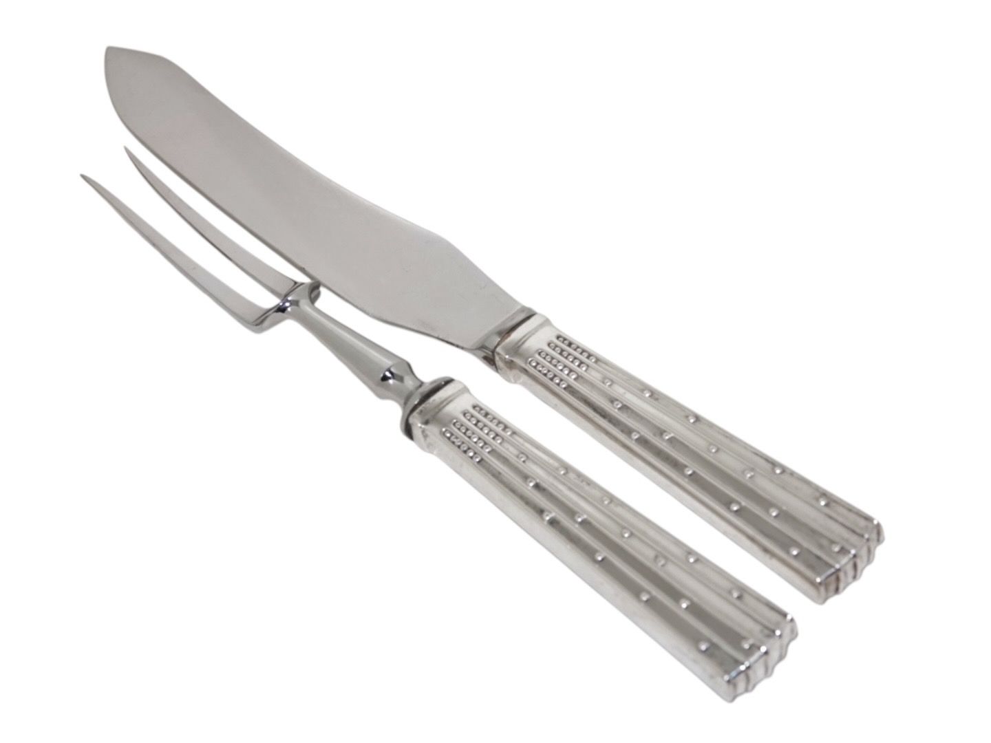 Champagne sølv og rustfrit stål. forskærersæt. ' Designet af Jens Harald Quistgaard og udført hos sølvsmed O.V. Mogensen. Længde 24,0 og 29,0 cm. Fin stand uden indgraveringer. Prisen er for begge.
