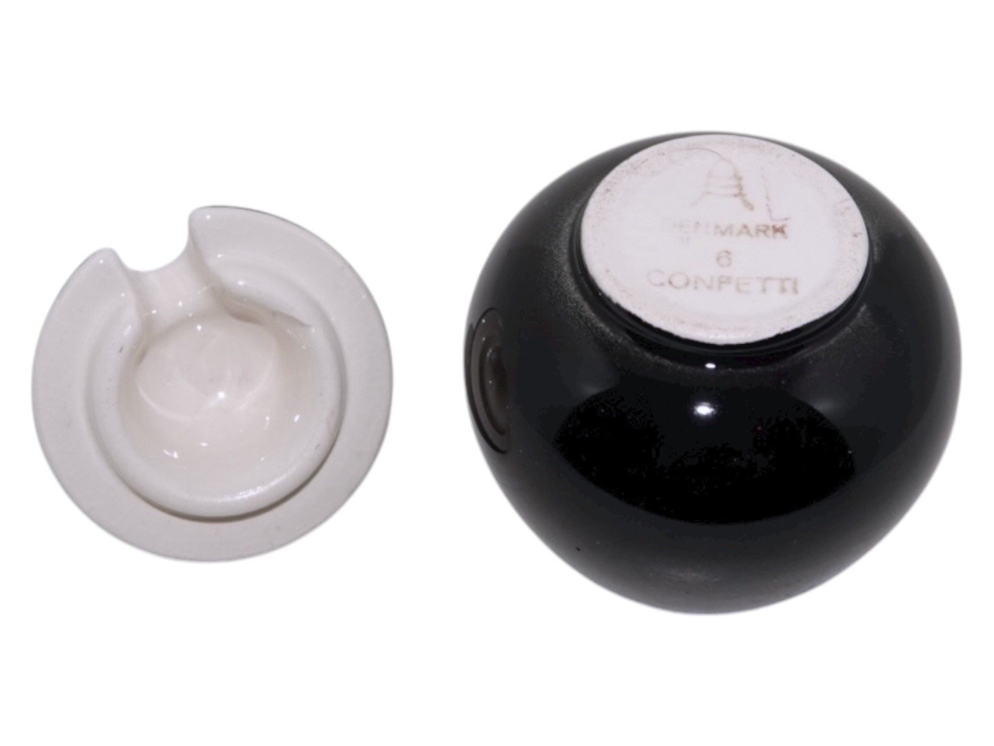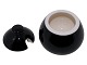Aluminia Confetti, sort sennepskrukke. Højde 7,5 cm. Der er et medfødt glaseret skår på indersiden af låg, se sidste foto ellers perfekt stand.