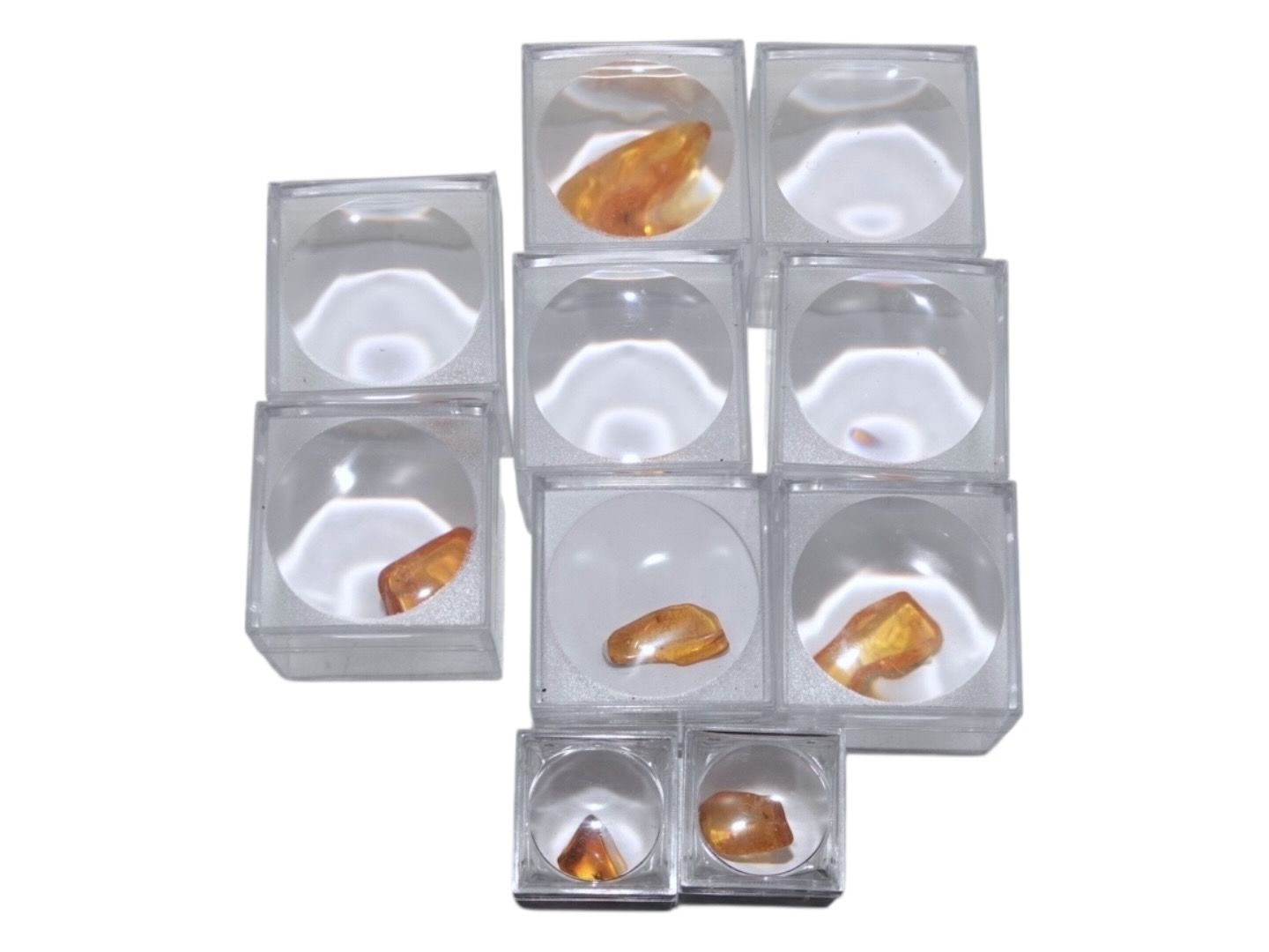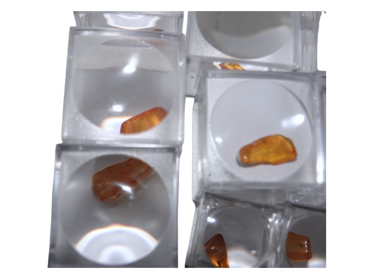 Ravstykkerne er poleret og hver ligger i en plastæske med forstørrelseseffekt.