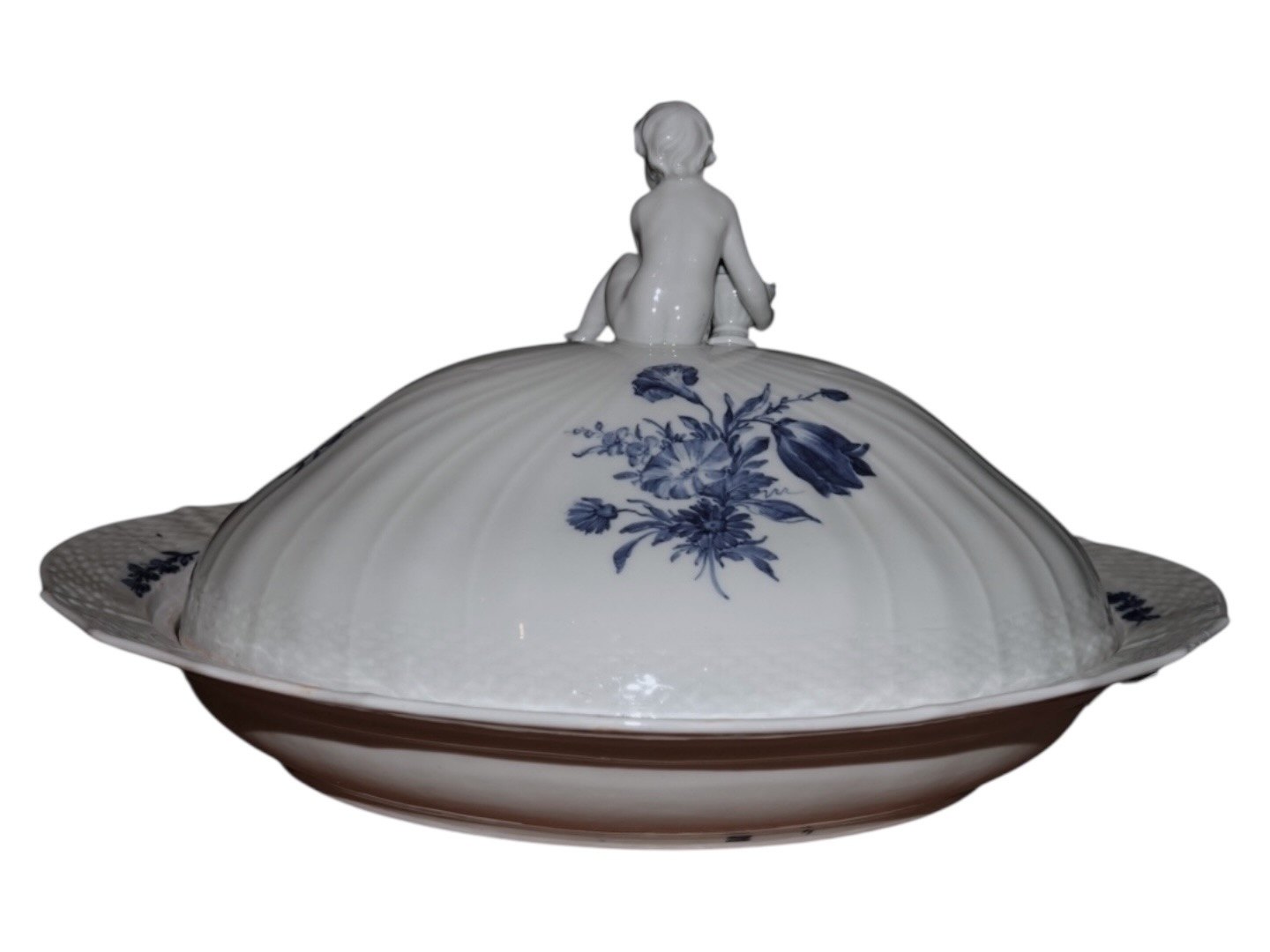 Royal Copenhagen Blue Flower Curved, extra large and rare lidded bowl with a boy figurine on top. It is an early piece that is grey in the porcelain instead of white.