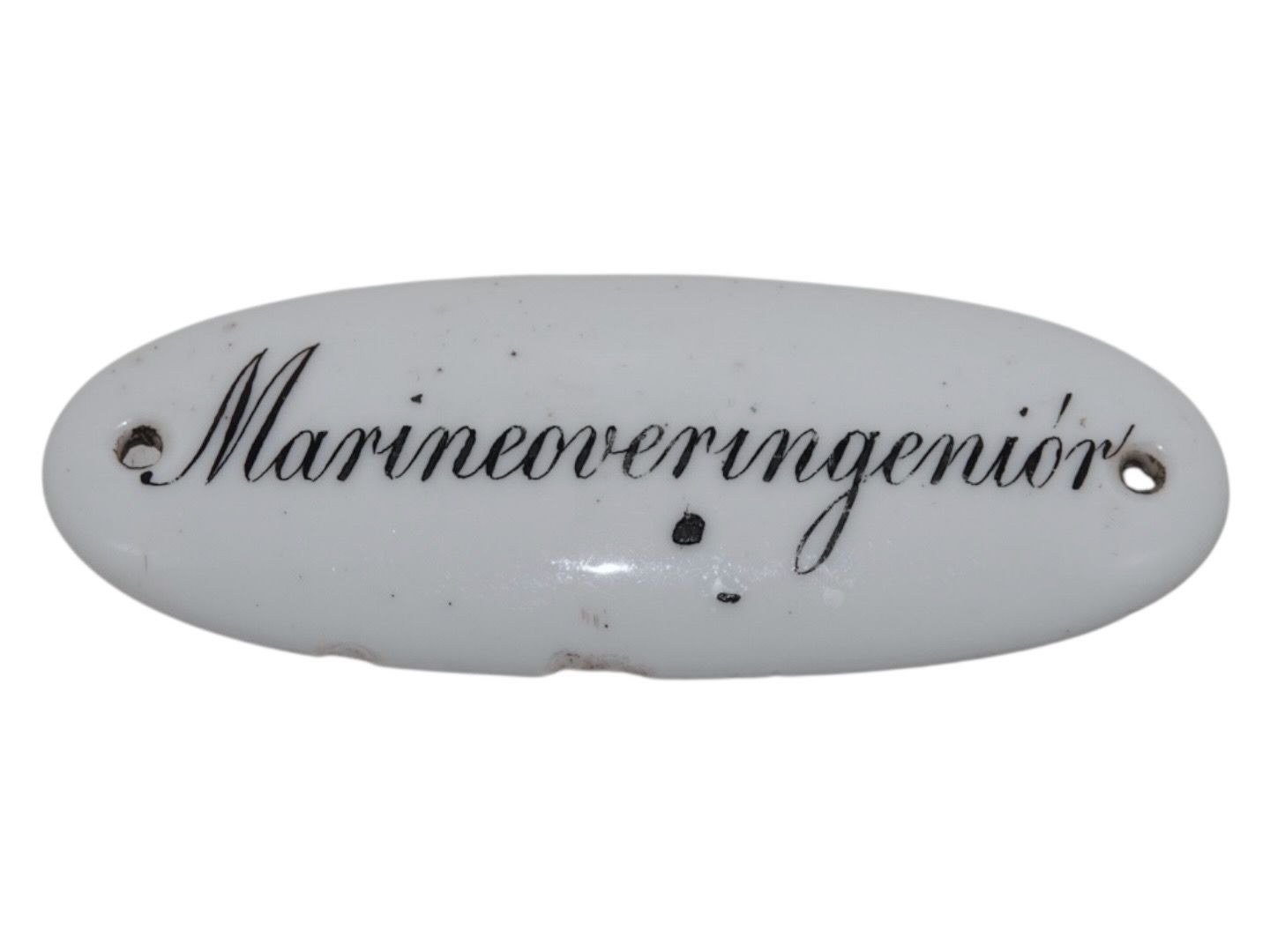 Royal Copenhagen hvidt skilt med teksten "Marineoveringenør".