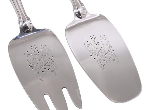 Georg Jensen Dobbeltriflet sterlingsølv, stort fiskeserveringssæt i en meget flot kraftig kvalitet. Disse er produceret efter 1945. Længde 21,5 cm. Perfekt stand uden indgraveringer. Prisen er for begge.
