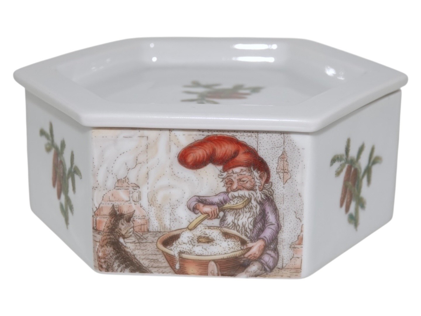 Bing & Grøndahl, sekskantet skål med låg dekoreret med nisser. Af fabriksmærket kan det udledes, at denne er produceret mellem 1970 og 1983. 2. sortering. Måler 12,2 x 12,2 cm., højde 5,5 cm. Perfekt stand uden fejl.