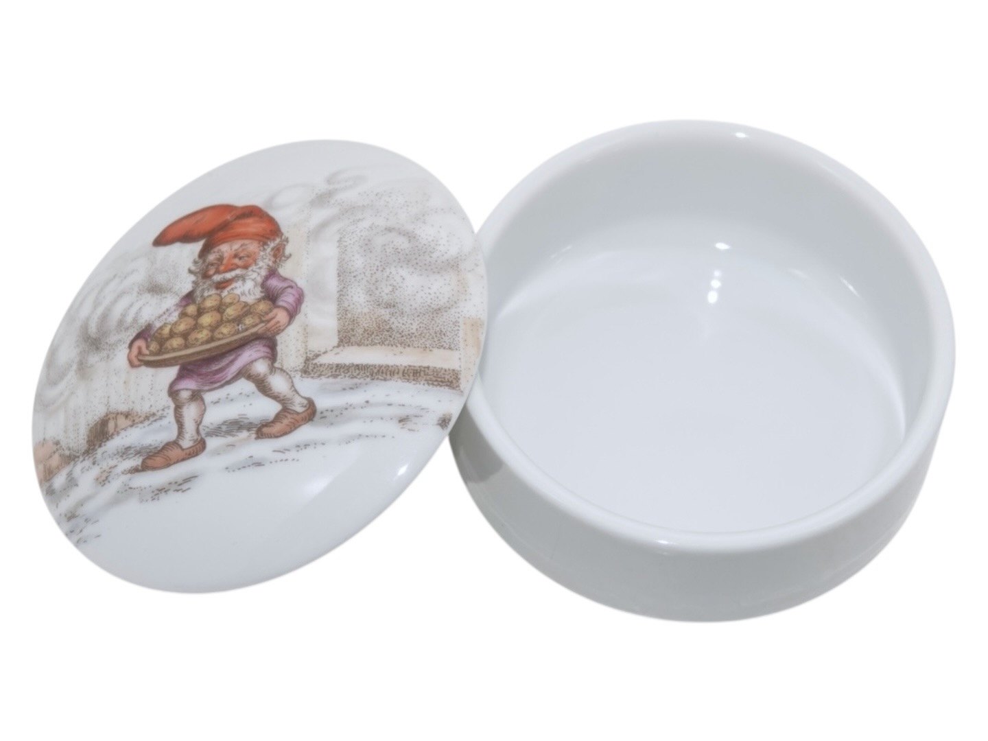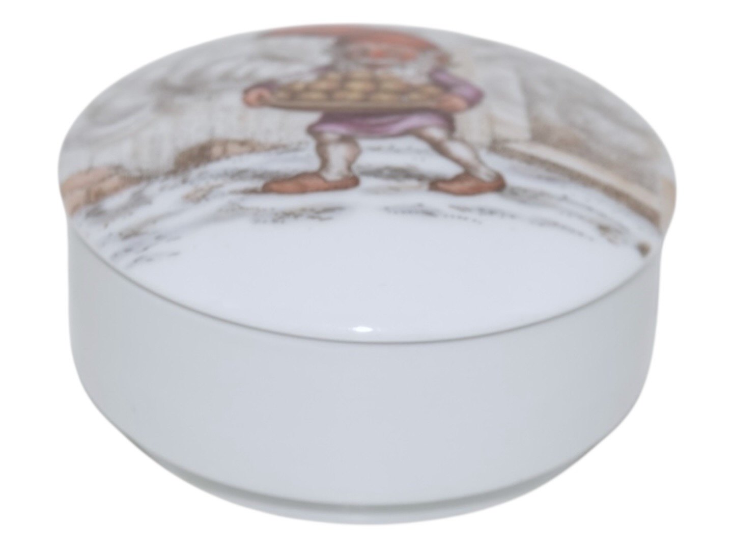 Bing & Grøndahl, rund bonbonniere med julenisse med æbleskiver.