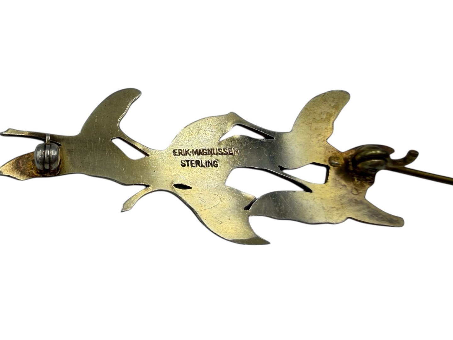 Erik Magnussen forgyldt sterlingsølv og emalje, broche med fem nordiske svaner. Stemplet "ERIK MAGNUSSEN STERLING ENERET". Længde 5,9 cm. Velholdt stand.