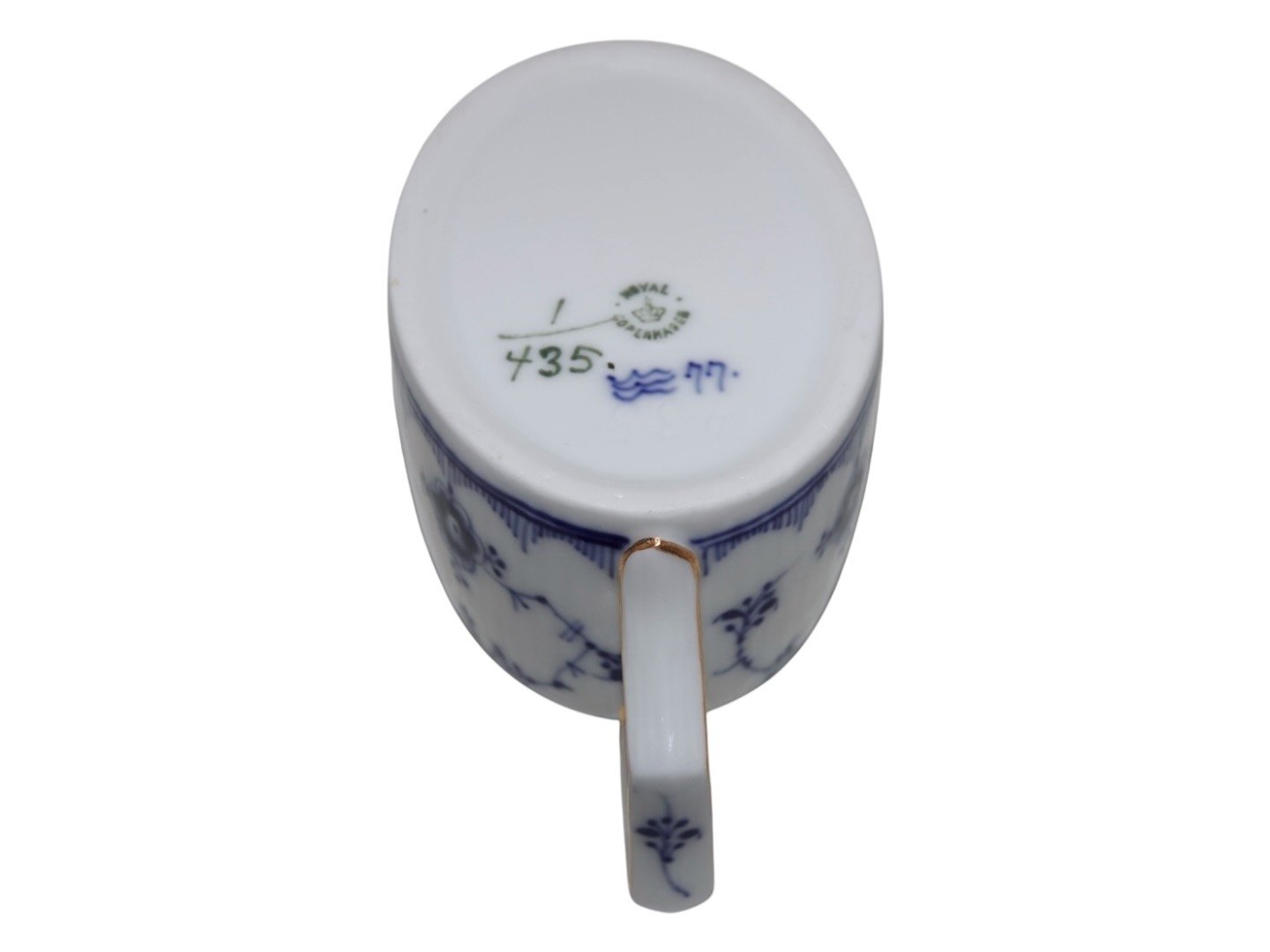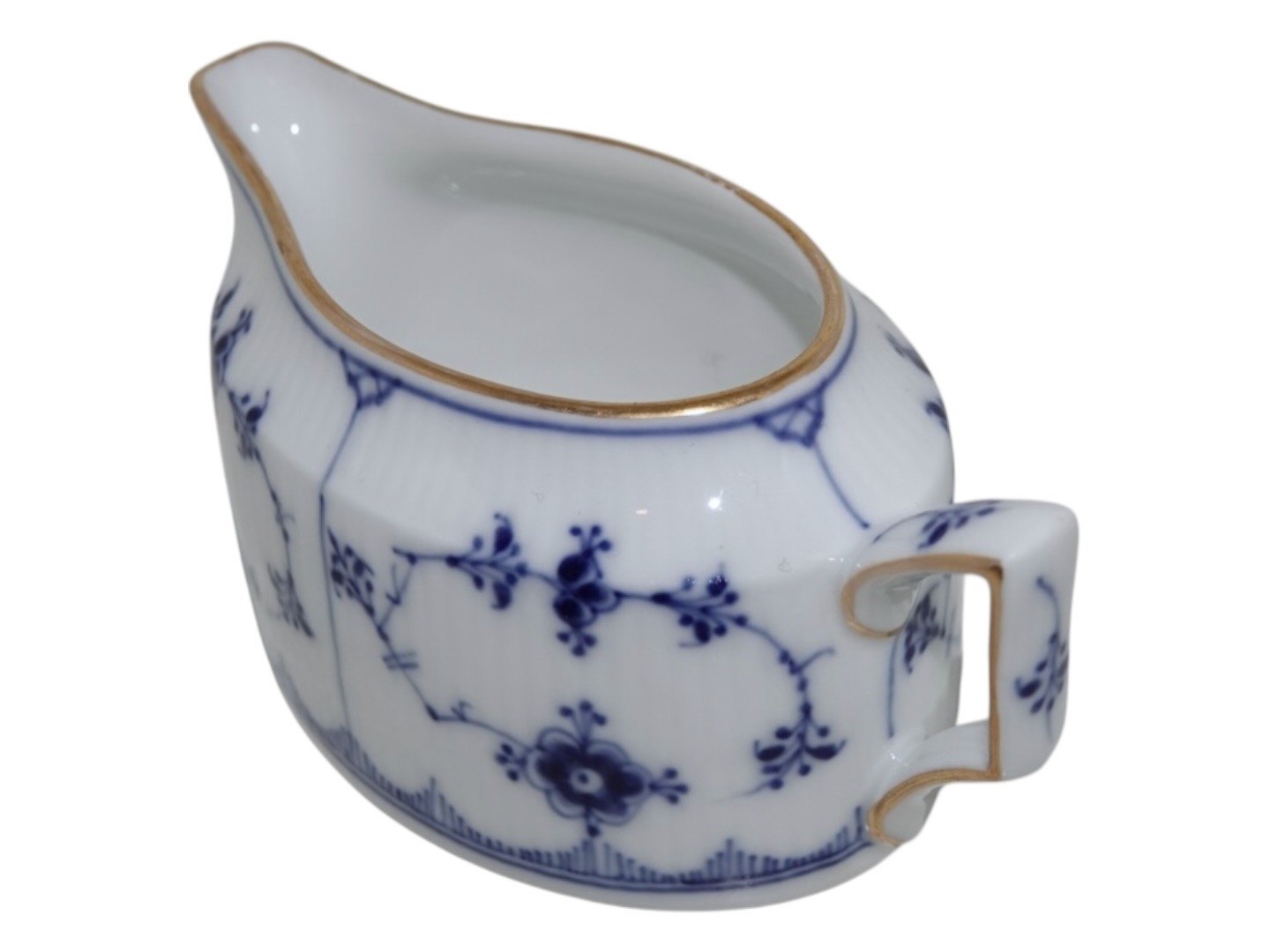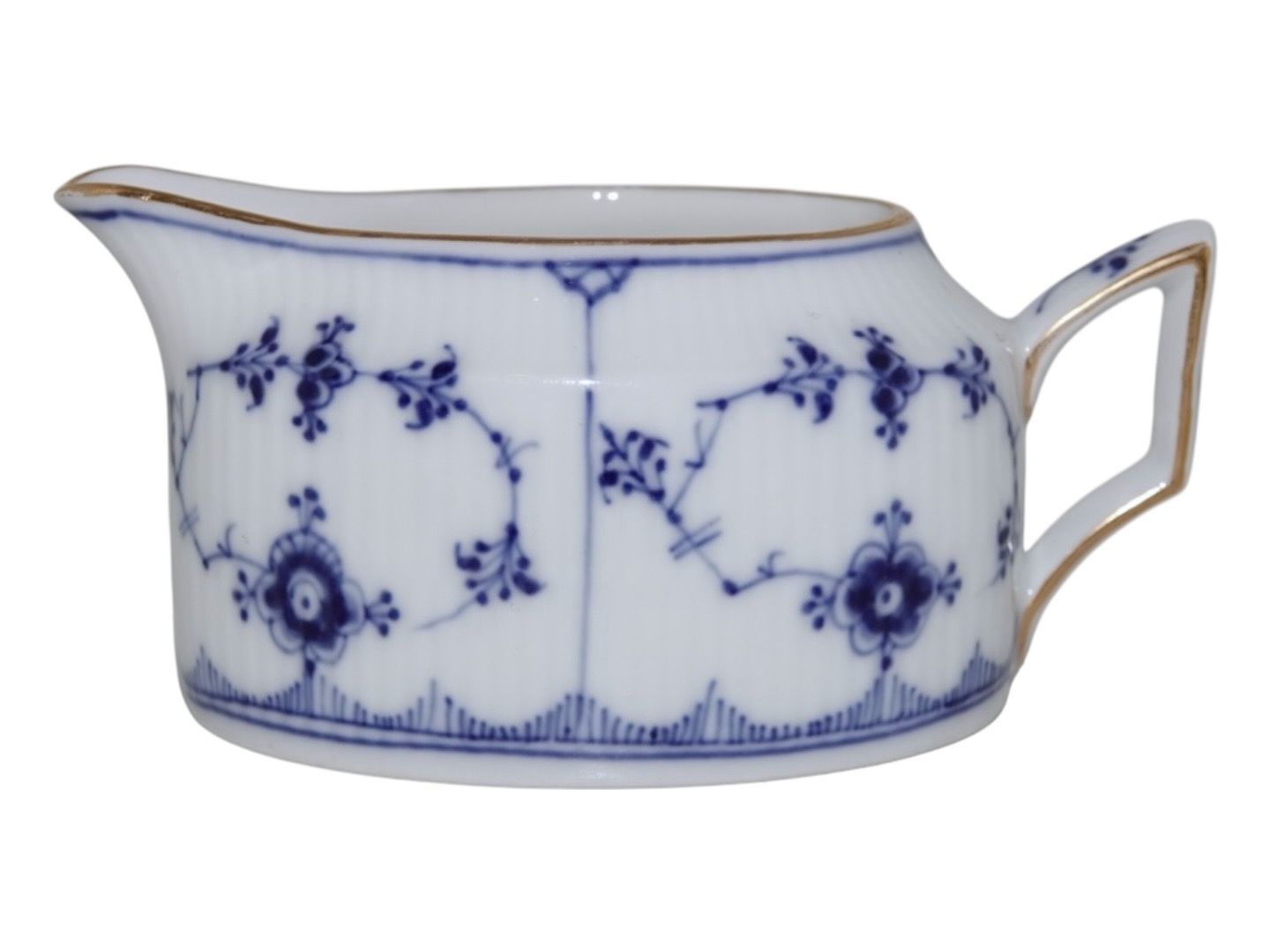 Royal Copenhagen Musselmalet Riflet med guldkant, sjælden, oval flødekande.