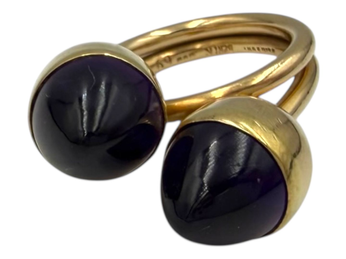 Bent Knudsen, stor 14 karat guldring med to runde lilla ametyster fra 1970'erne. Lækker kraftig kvalitet. Designnummer 69. Stemplet "BENT K 585 DANMARK 69". Ringstørrelse 53. Flot og velholdt stand.
