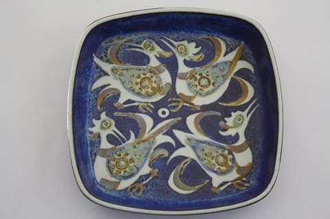 Aluminia/Royal Copenhagen, Kunstfajance, Baca, Firkantet fad med fugle. Designet af Niels Thorsson. Nr. 708/2883. 16,5 x 16,5 cm. Højde 3,3 cm. I. sortering. Arkivfoto. Denne er fra Aluminia og i flot stand. Pris: 300 kr. stk. Lager: 1