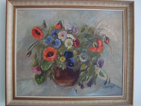 Maleri af Ingeborg Debois - Vase med valmuer, kornblomster, stedmoderblomster m.fl.