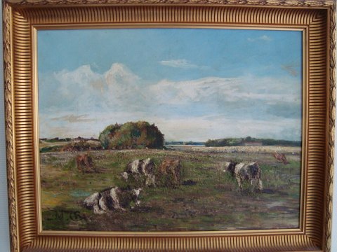 Maleri af Niels Christiansen - Køer og kvier på engen.