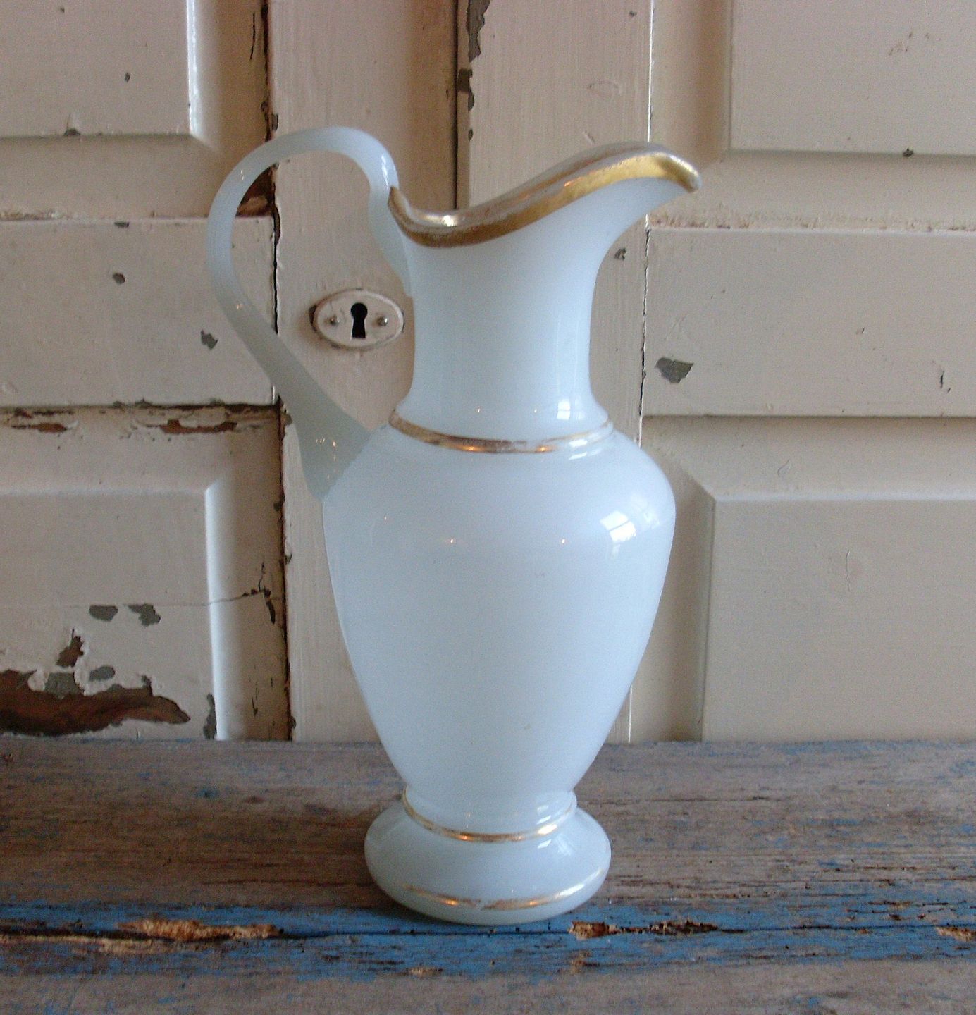 Meget smuk kande i hvid opaline med guld bemaling.