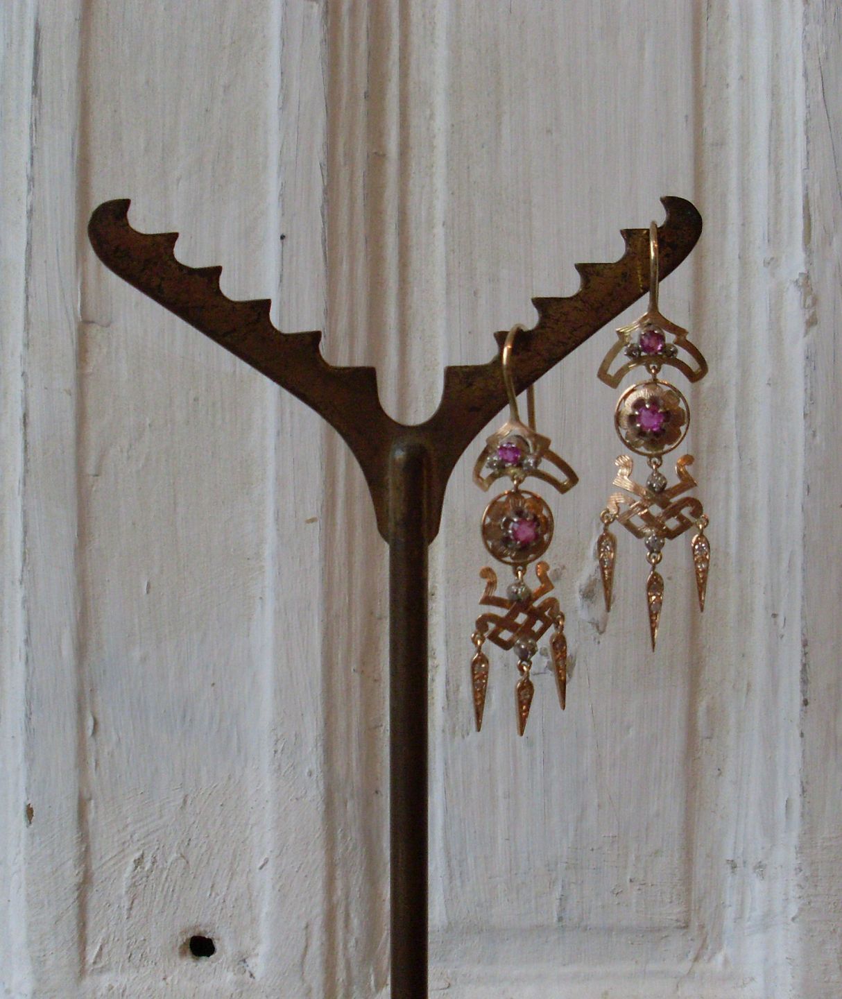 Pair of 18 kt earrings with rose-cut diamonds and rubies