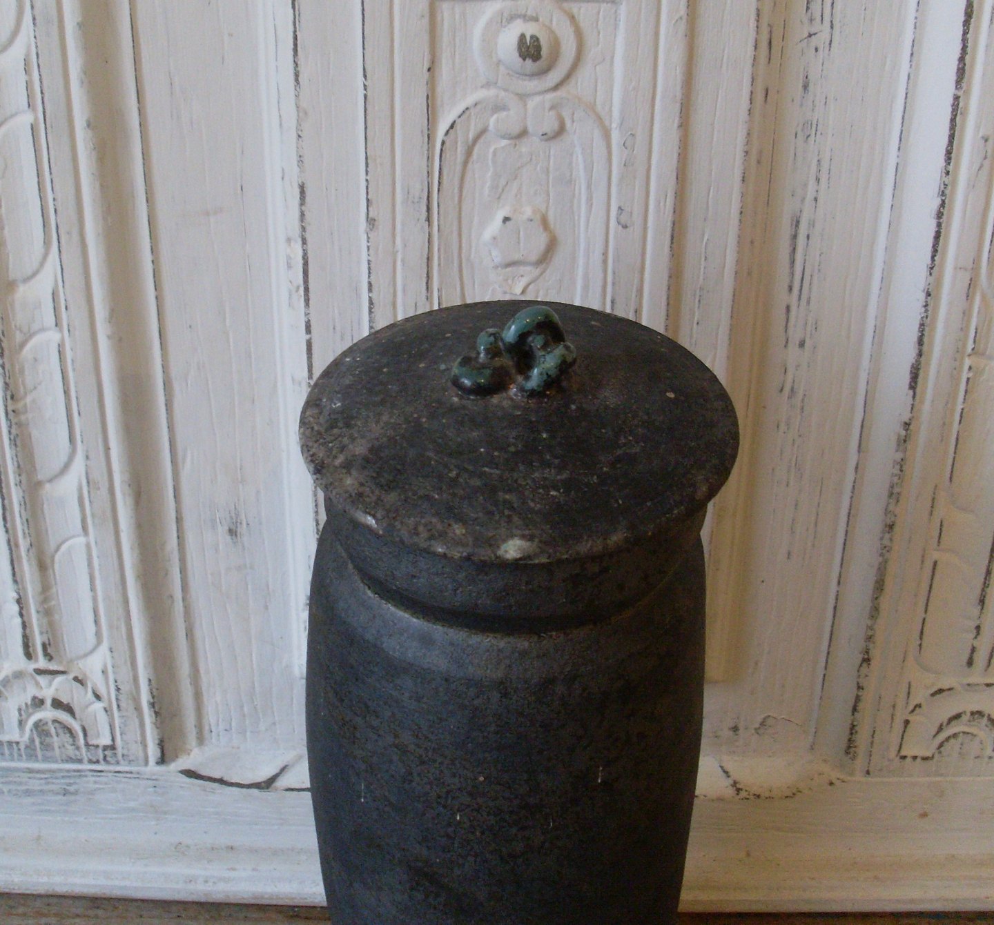Æstetisk smuk slank låg vase med ornamental dekoration på lågets top.