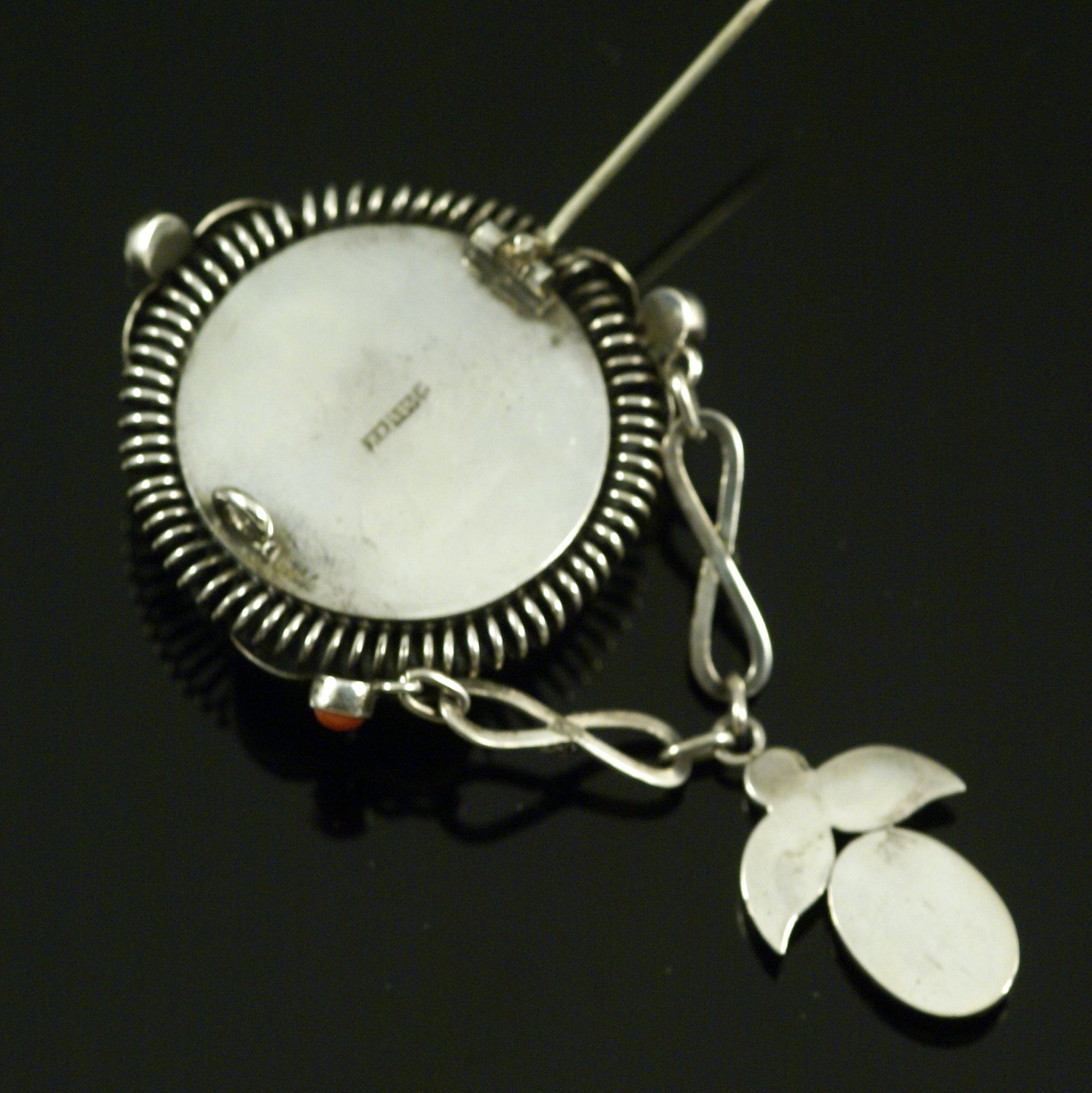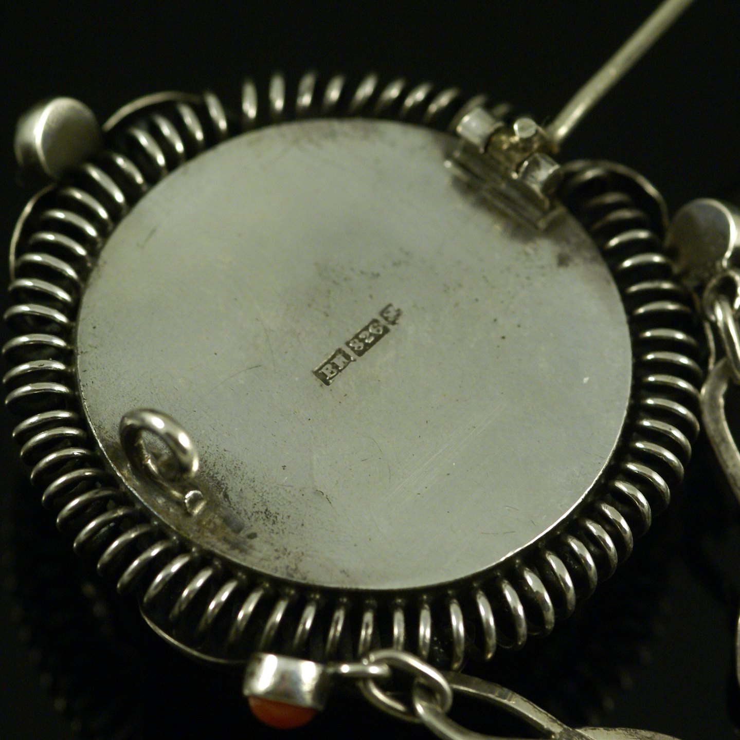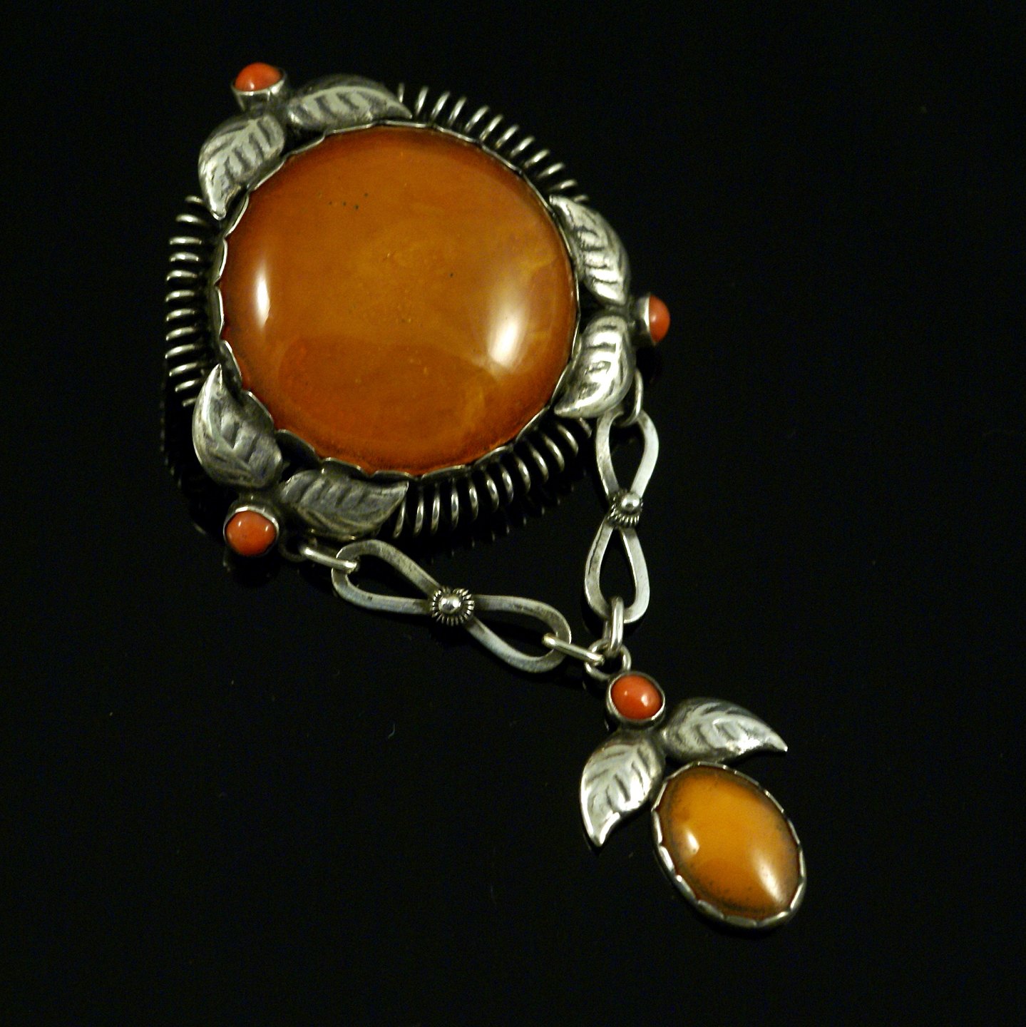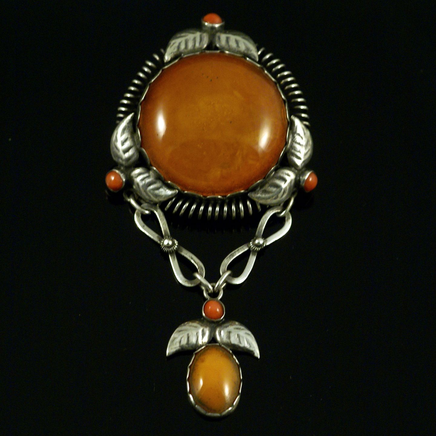 Bernhard Hertz. Skønvirke Broche i Sølv med rav og koraler.