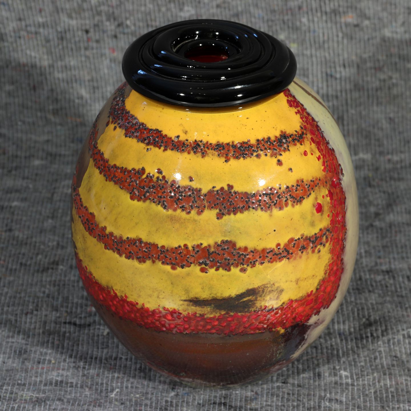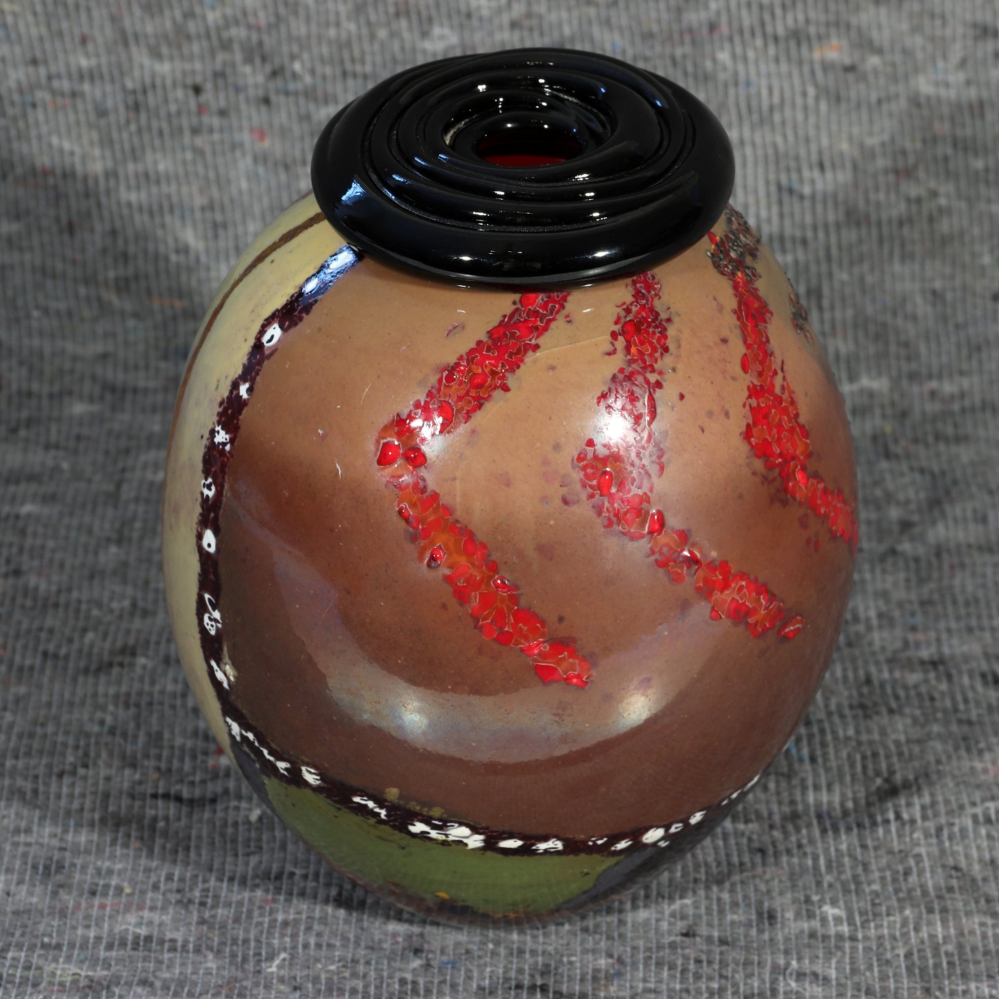 Vase i farvet glas designet af Marianne Buus, OBS revnet gennem korpus,