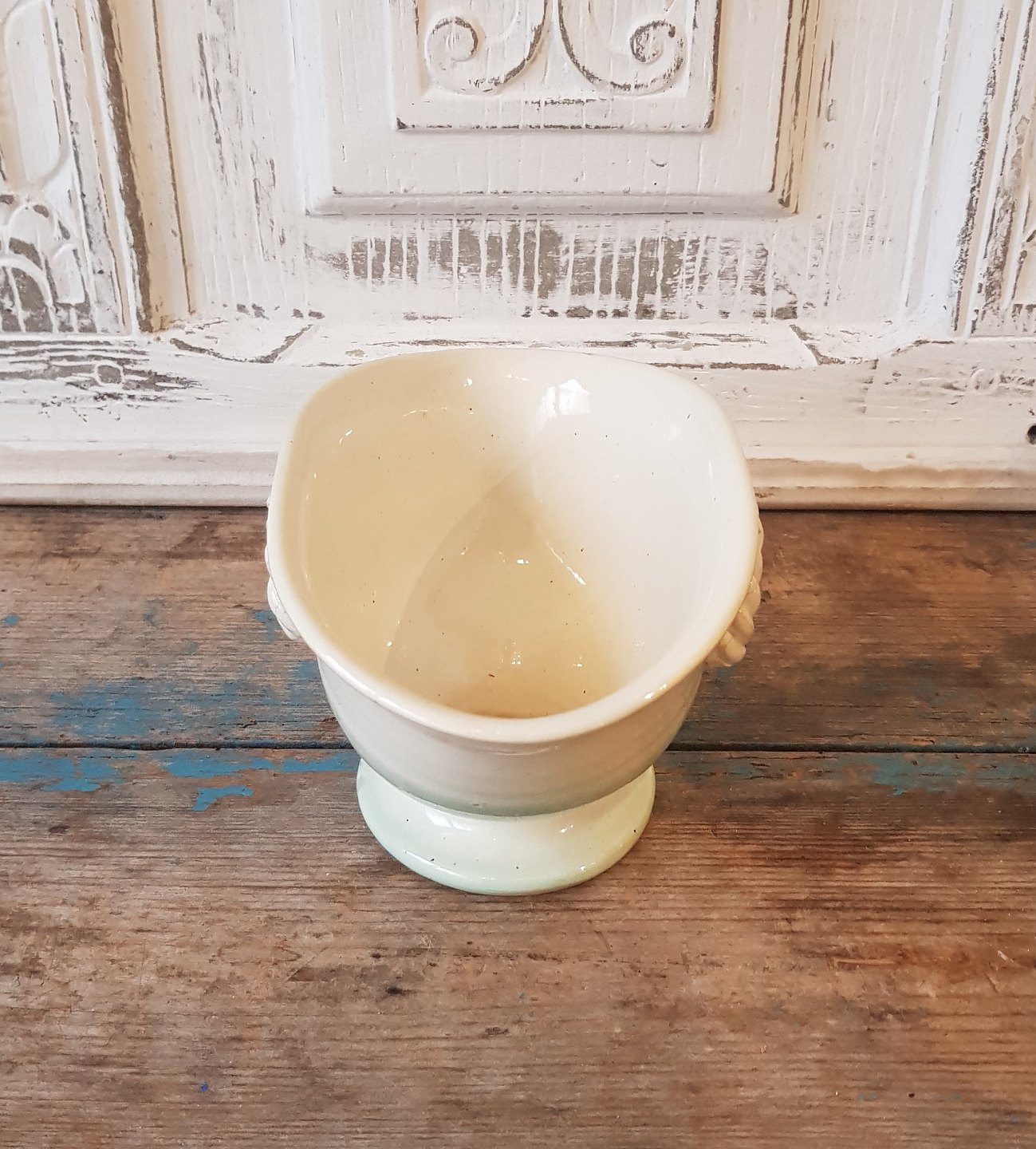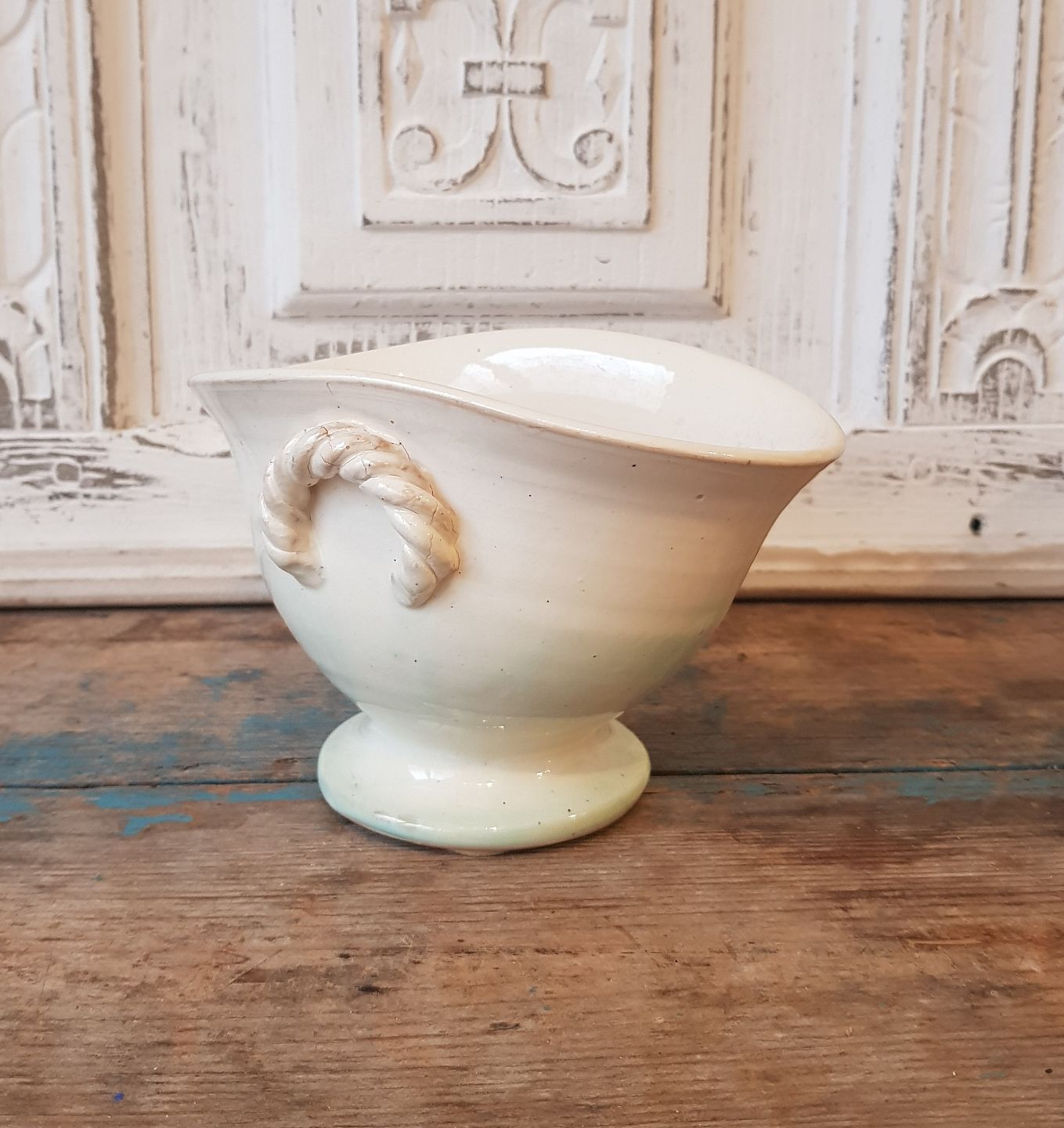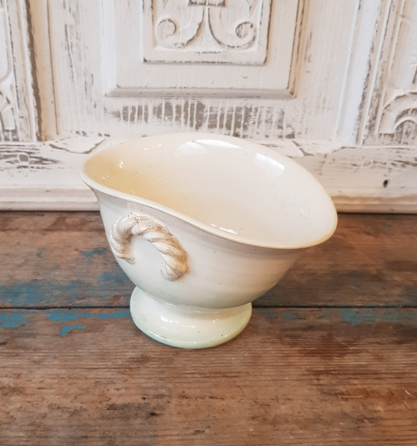 Cremefarvet keramik skål på fod med hanke