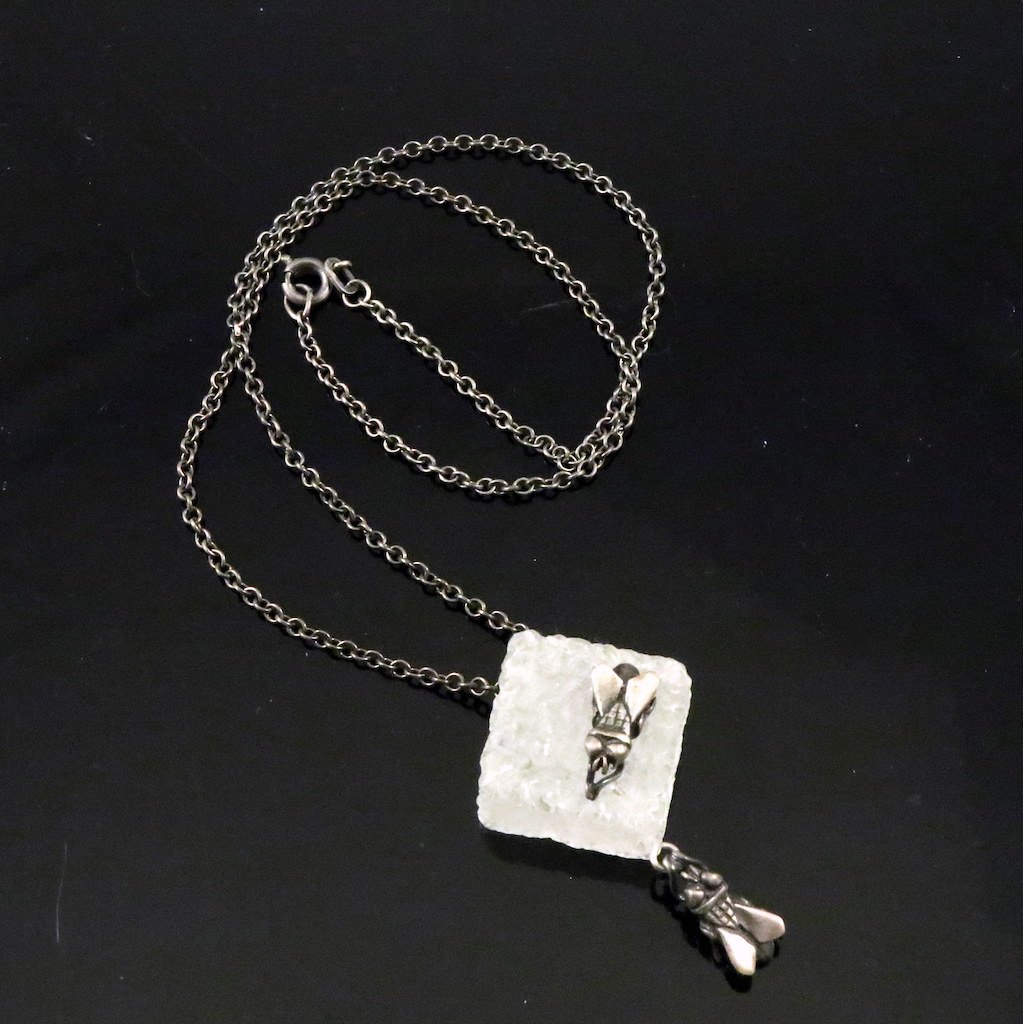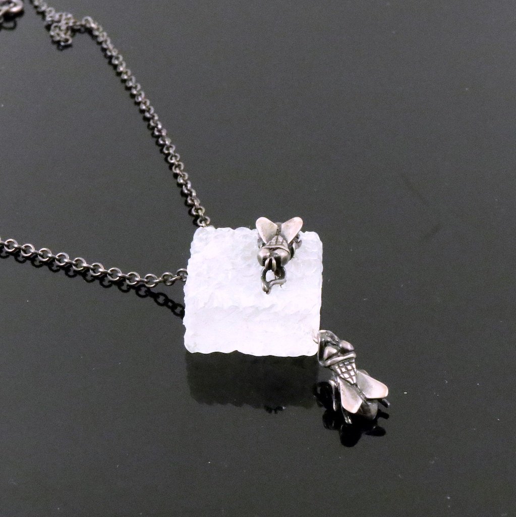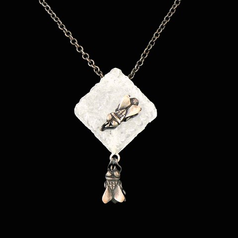 Flue i oxideret og forgyldt sterling sølv. Sukkerknald i akryl.