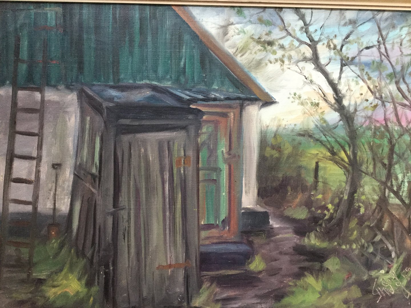 Maleri af Thorvald Jørgensen - Gårdeksteriør med das 1959
