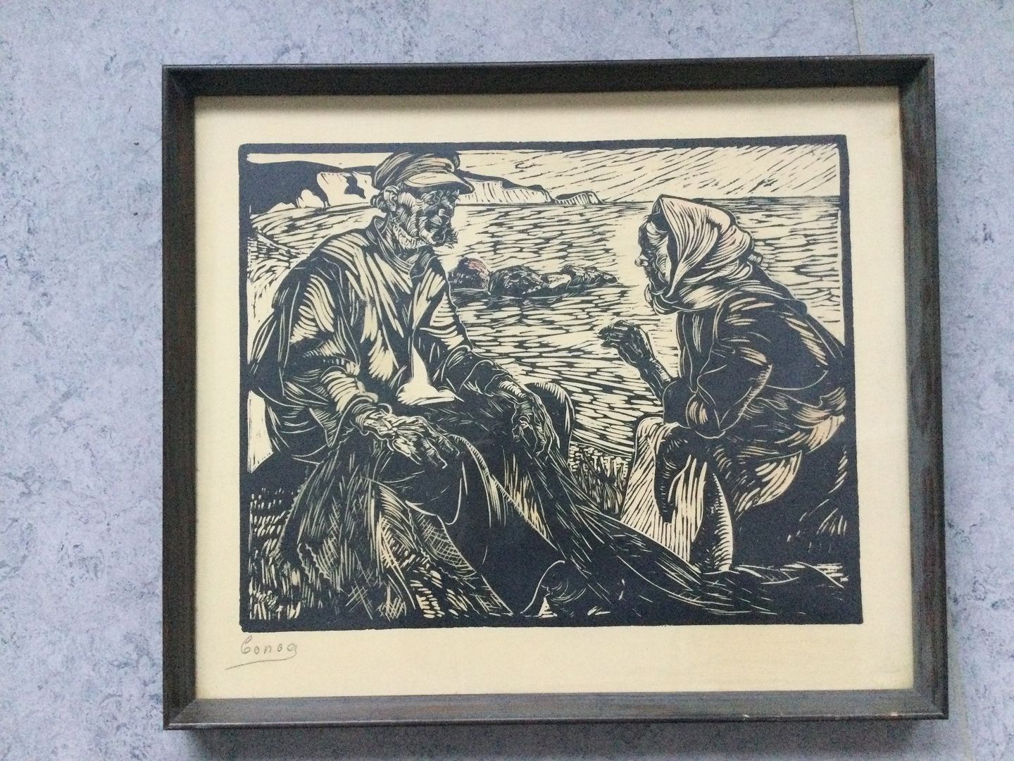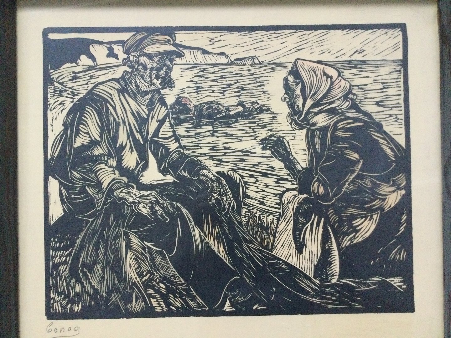 Træsnit af Svend Mussmann - Fisker og fiskerkone bøder garn.